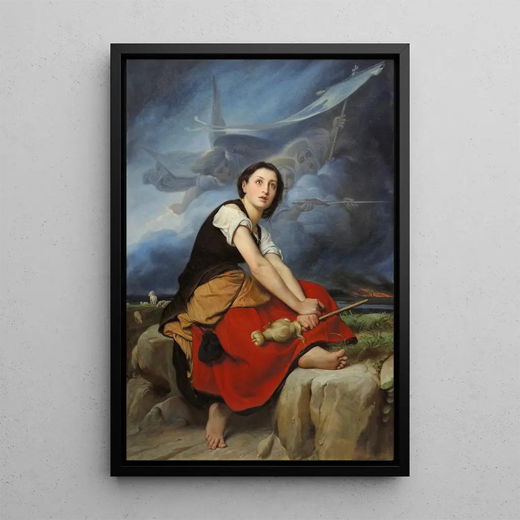 I detta ikoniska verk fångar François-Léon Benouville ett avgörande ögonblick i Jeanne d'Arc:s liv, där den unga hjältinnan, plågad av sina visioner, tycks sväva mellan den jordiska världen och det gudomliga. De rika färgerna och de noggranna detaljerna i målningen skapar en mystisk atmosfär, förstärkt av det mjuka ljuset som lyser upp Jeanne:s ansikte. Kompositionen, centrerad kring hennes uppmärksamma lyssnande, inbjuder betraktaren att känna djupet av hennes andliga engagemang. Konstnären lyckas förmedla en påtaglig känsla, vilket gör detta konsttryck av "Jeanne d'Arc lyssnar på sina röster" till mer än bara en tavla, utan en verklig kontemplativ upplevelse.