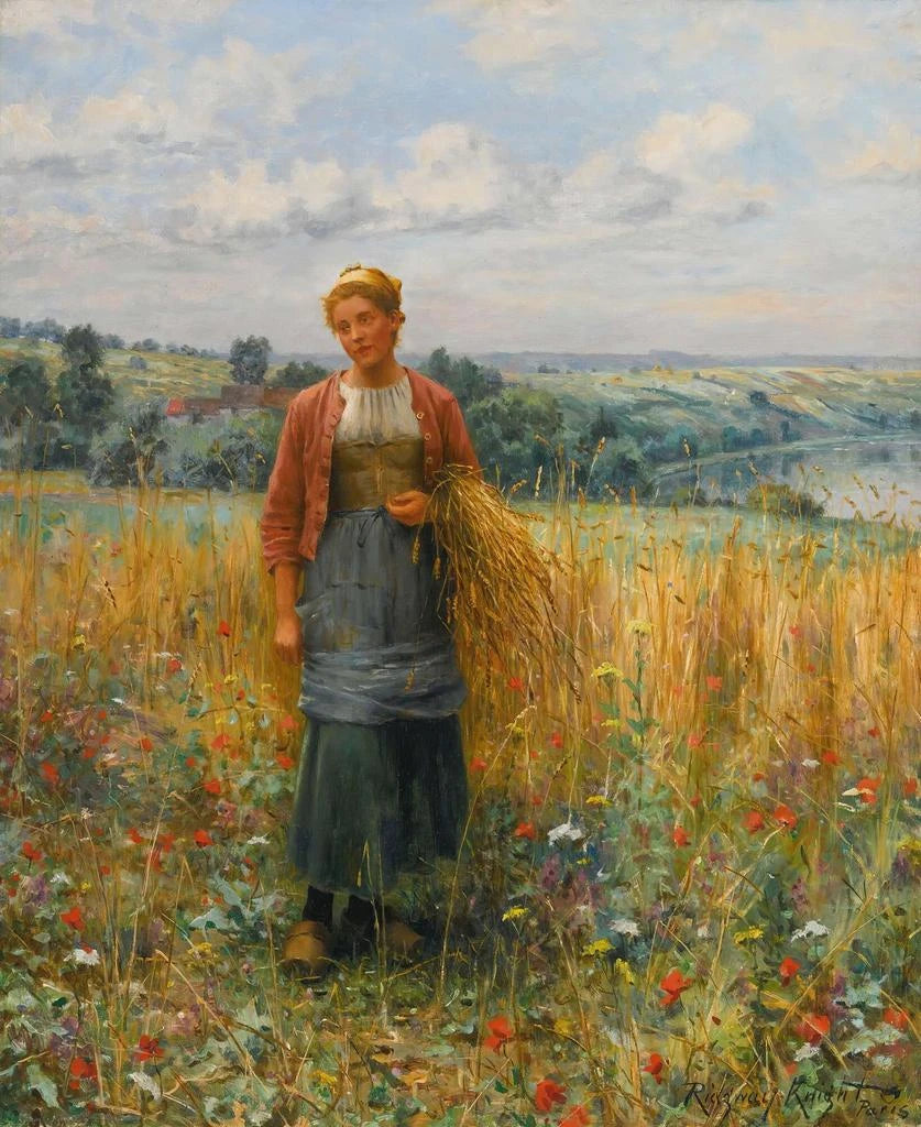 Daniel Ridgway Knight, amerikansk målare från 1800-talet, är ofta associerad med impressionism och realism. Hans konstnärliga bana leder honom till att utforska landskap i Frankrike, där han upptäcker en förnyad inspiration i böndernas liv och scener från det lantliga livet. Knights känslighet för naturens skönhet och den mänskliga tillvaron återspeglas i hans verk, som fångar ögonblick av melankoli och glädje. Hans inflytande är tydligt inom konstvärlden, där han inspirerar generationer av målare att omfamna naturen och mänskliga känslor som centrala motiv i sitt arbete. "Jeannine Gleaning" är ett perfekt