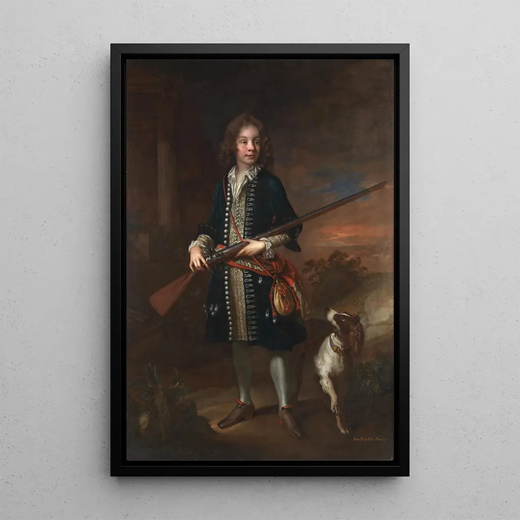 I porträttet "John Poulett premier comte Poulett" fångar John Closterman själva essensen av den engelska aristokratin under 1600-talet. Greven, klädd i en praktfull ceremoniell dräkt, står med en ståtlig hållning som understryker hans höga status. De rika färgerna och de raffinerade detaljerna i målningen, såsom broderierna på hans kostym och glansen av hans smycken, vittnar om Clostermans talang att förmedla lyx och sofistikering. Bakgrunden, subtilt utarbetad, framhäver den centrala figuren samtidigt som den tillför djup till kompositionen, vilket skapar en harmonisk balans mellan motivet och dess omgivning.