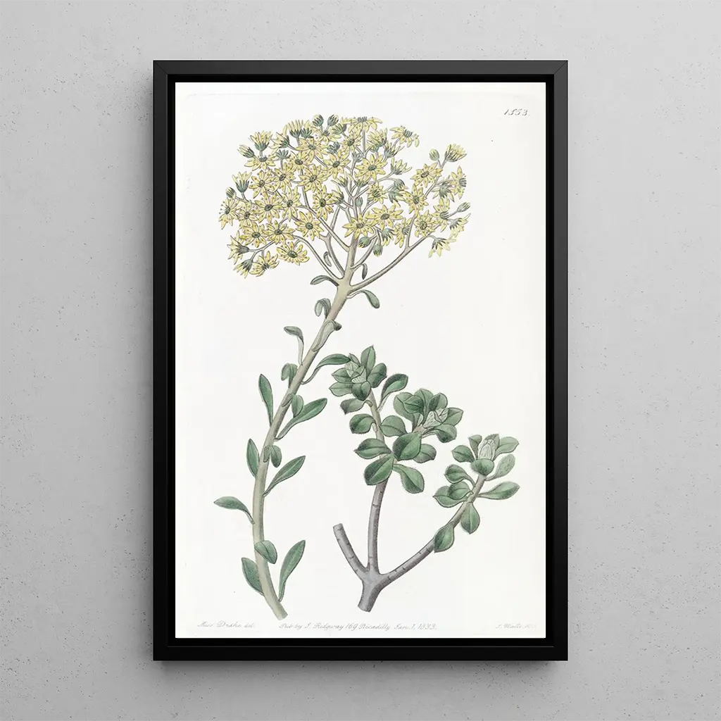 Detta konsttryck "Joubarbe velue" av Sydenham Edwards fångar själva essensen av denna robusta växt, känd för sin förmåga att frodas under svåra förhållanden. Nyansen av grönt och gult blandas harmoniskt, vilket skapar en lugn och fridfull atmosfär. Akvarelltekniken gör det möjligt att återge de lurviga texturerna på bladen med en anmärkningsvärt fin känsla, medan kompositionen lyfter fram den inneboende skönheten hos denna växt. Varje penseldrag verkar berätta en historia om överlevnad och anpassning, och bjuder in betraktaren att uppskatta naturens enkelhet och styrka.