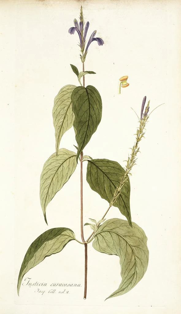Nikolaus Joseph Freiherr von Jacquin, botanist och konstnär från 1700-talet, präglade sin tid med sina precisa och poetiska botaniska illustrationer. Hans resor till Sydamerika gav honom möjlighet att upptäcka en mängd växter, inklusive Justicia caracasana. Påverkad av de vetenskapliga strömningarna under sin tid, lyckades Jacquin förena konst och vetenskap, och bidrog till att utveckla botanisk kunskap. Hans verk är ett vittnesmål om förundran inför naturen och vikten av dess bevarande, vilket gör honom till en framstående figur inom botanisk illustration.