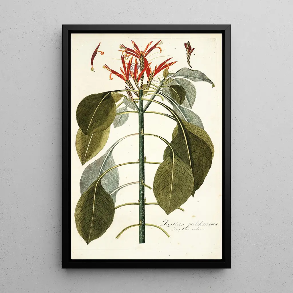 Konsttrycket av Justicia pulcherrima fördjupar oss i en livfull värld där naturen uttrycker sig med glans. Blommornas kronblad i starkt rött och nyanser av orange sticker ut mot en grönskande bakgrund, vilket skapar en slående kontrast. Akvarelltekniken, som används av Nikolaus Joseph Freiherr von Jacquin, möjliggör fångsten av blommornas ömtålighet samtidigt som den ger ett exceptionellt ljus. Atmosfären som avtecknar sig i detta verk framkallar värmen från tropikerna och inbjuder till att betrakta den naturliga skönheten.