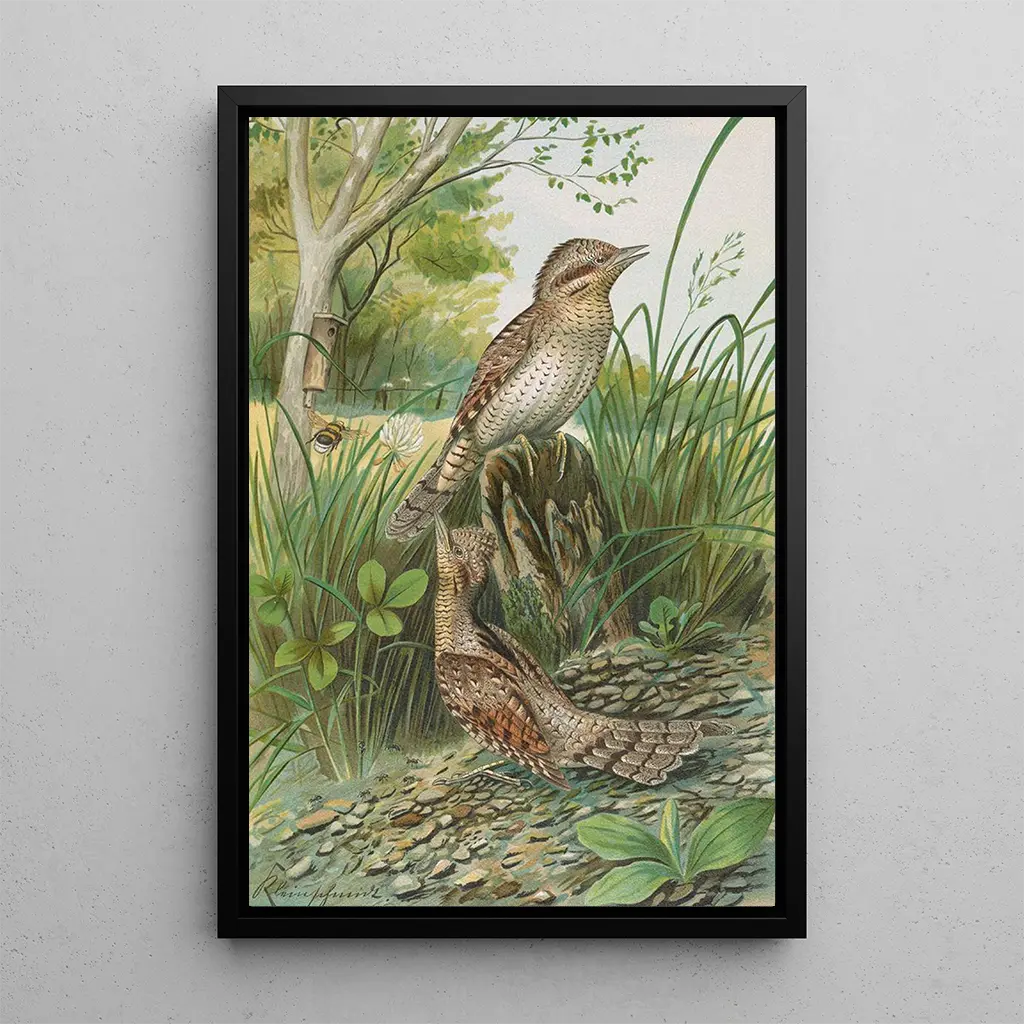 Konsttrycket av Jynx torquilla, även känt som Jynx torquilla, avslöjar en fågel med delikat fjäderdräkt, spridd med nyanser av brunt och guld. Denna duk, utförd med en noggrann teknik, fångar själva essensen av naturen. De fina detaljerna i fjädrarna och fågelns livfulla uttryck framkallar en lugn och kontemplativ atmosfär. Bakgrunden, subtilt suddig, framhäver fågelns skönhet och skapar en visuell harmoni som inbjuder till förundran. Varje penseldrag tycks andas liv, vilket gör detta konsttryck fängslande och tidlöst.