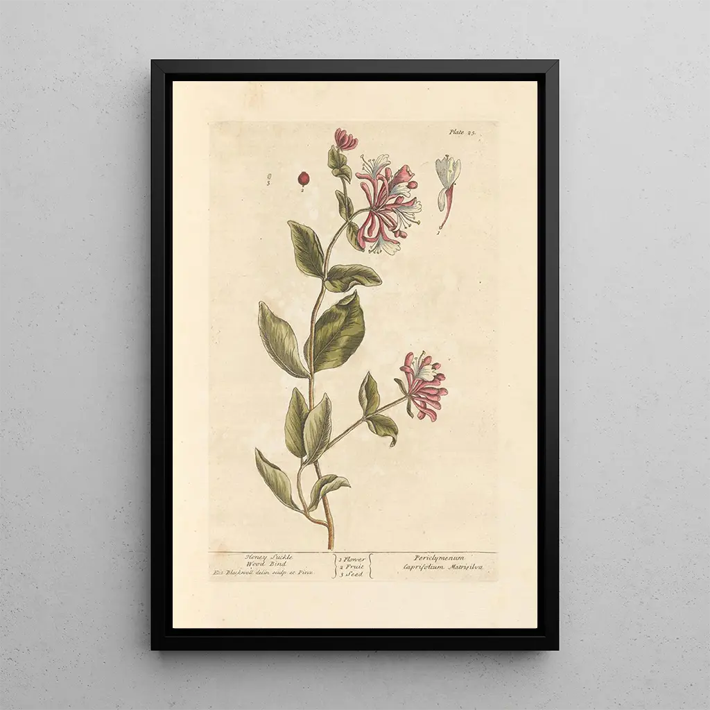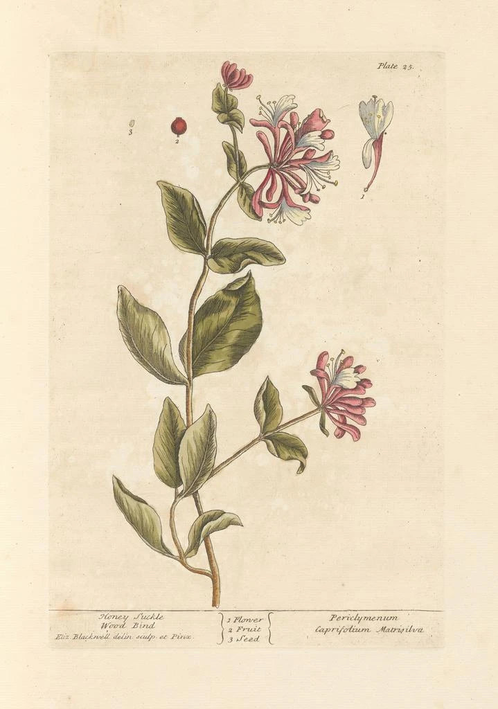 Konsttrycket Chèvrefeuille av Elizabeth Blackwell är ett verk som hyllar naturens skönhet genom noggranna detaljer och mjuka färger. Detta konsttryck, skapat med en graveringsteknik, framhäver kaprifolblommorna, med sina delikata kronblad och vibrerande blad. Atmosfären som utstrålas är både lugnande och inspirerande, inbjudande betraktaren att fördjupa sig i en värld av frid. Nyansen av grönt och gult, kombinerat med inslag av rosa, skapar en harmonisk balans som drar till sig blicken och stimulerar fantasin.