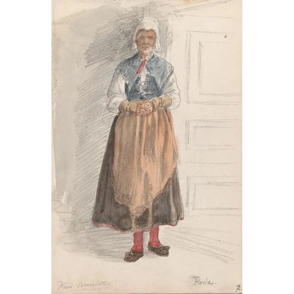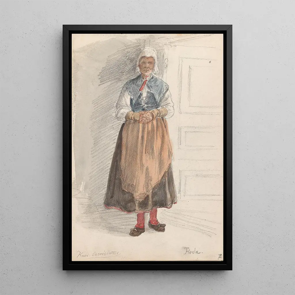 I denna konsttryck av Kari Saorisdatter Floda fångar Adolph Tidemand själva essensen av den norska naturen. Kompositionen domineras av mjuka nyanser av grönt och blått, som framkallar de majestätiska landskapen vid fjordarna. De noggrant utarbetade detaljerna i de traditionella kläderna hos figurerna tillför en mänsklig dimension till denna idylliska scen. Atmosfären är fylld av lugn, vilket inbjuder betraktaren att fördjupa sig i ett ögonblick av stillhet och eftertanke. Tidemand lyckas förmedla en djup koppling mellan människan och hennes omgivning, vilket gör detta konsttryck både poetiskt och känslosamt.