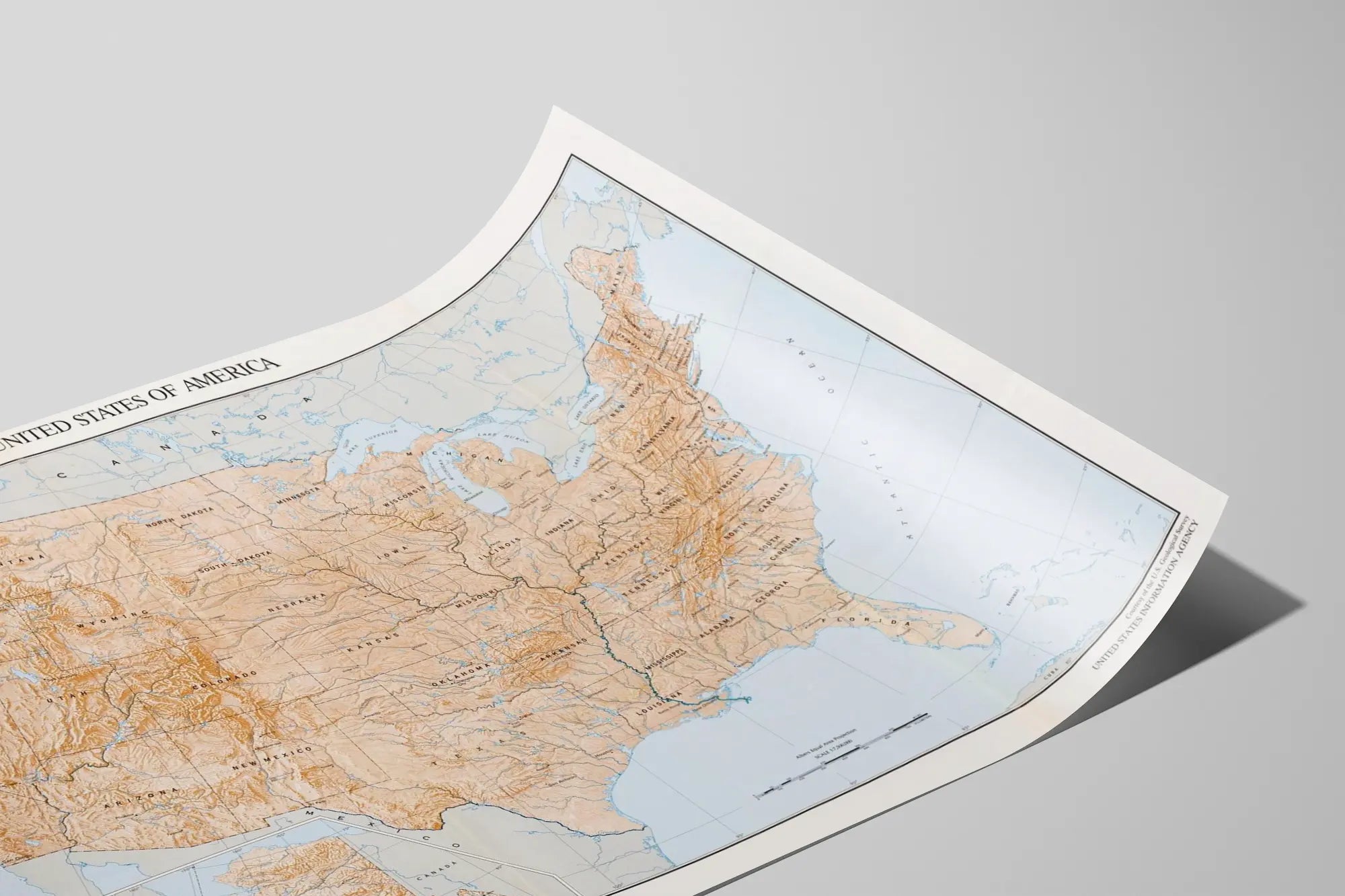 Detta väggstöd är ett utmärkt komplement för den som vill utforska den amerikanska geografin visuellt samtidigt som man dekorerar sitt hem med en pedagogisk och elegant affisch. Oavsett om det är för personligt bruk eller som en presentidé till en kartläggningsentusiast, erbjuder denna fina och fullständiga topografiska framställning av Förenta staterna en varm och lärorik atmosfär till ditt boende.