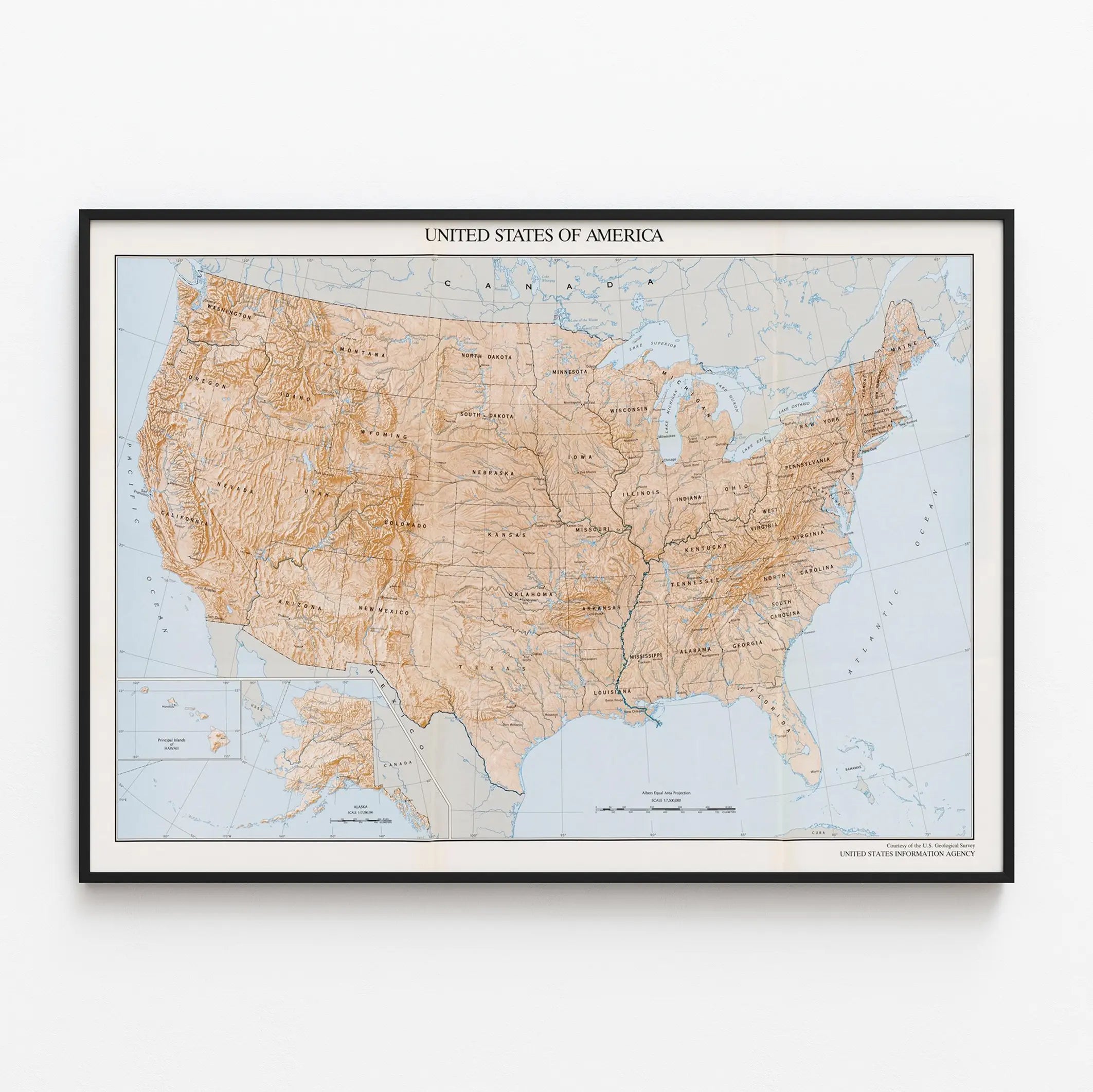 Kartan inkluderar även de viktigaste vattendragen samt de stora städerna markerade på ett enkelt sätt, vilket förstärker dess pedagogiska och dekorativa funktion. Två särskilda inramningar för de specifika regionerna i Alaska och de största öarna i Hawaii tillför en komplett känsla till hela sammansättningen, och garanterar en övergripande förståelse av det amerikanska territoriet. Närvaron av Atlanten och Stilla havet längs kartans kanter ger en känsla av oändlighet till kompositionen.