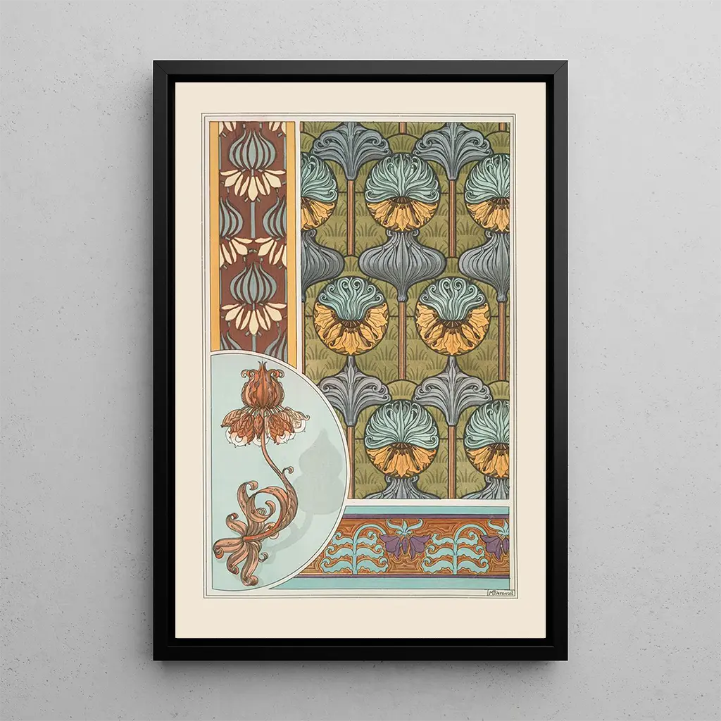 Konsttrycket av Couronne impériale 2 av Maurice Pillard Verneuil framkallar en frodig värld där naturen blomstrar i ett sprakande av livfulla färger. De blomsterinspirerade mönstren, varsamt arrangerade, breder ut sig med en utsökt elegans och skapar en atmosfär som är både festlig och lugnande. Akvarelltekniken, använd med mästerlighet, ger verket en lätthet och transparens som inbjuder till eftertanke. Varje detalj, varje nyans av färg, tycks vibrera under ljuset och förflyttar betraktaren till en hemlig trädgård där skönheten råder.