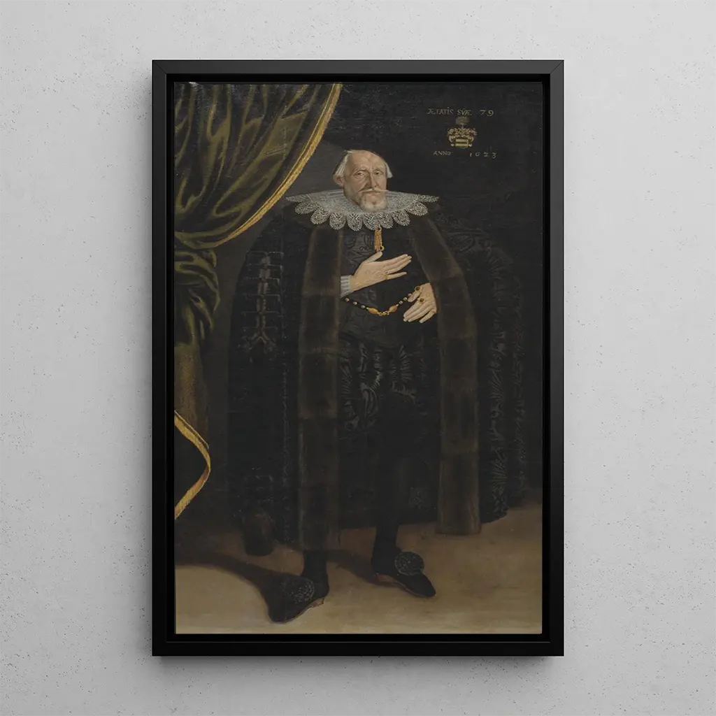 Konsttrycket "Klas Bielke de Ker" skildrar en majestätisk figur, klädd med omsorg och elegans. De minutiösa detaljerna i hans dräkt, liksom det reflekterande uttrycket i hans ansikte, vittnar om en enastående mästarkonst inom målarkonsten. De rika och djupa färgerna, kombinerade med en subtil belysning, skapar en atmosfär som är både högtidlig och intim. Detta konsttryck nöjer sig inte med att avbilda en individ; det fångar essensen av en epok då adel var synonymt med makt och prestige, och bjuder in betraktaren att reflektera över identitet och status hos motivet.