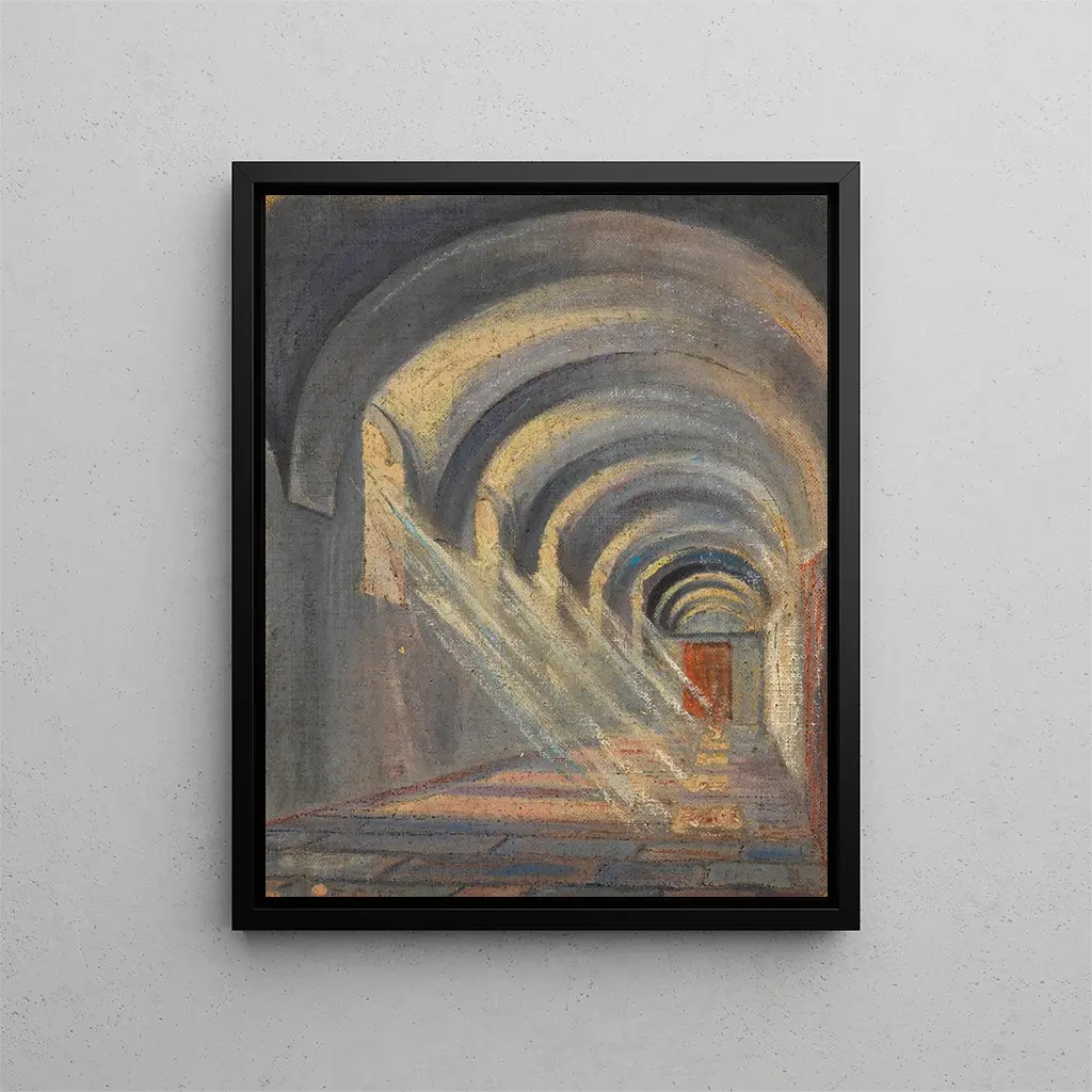 Egon Schiele, känd för sin distinkta stil och förmåga att uttrycka komplexa känslor, använder här en rik och djärv palett. Verket "Cloître med direkt solljus" utmärker sig genom sina slående ljusspel, där solen tränger igenom klostrets bågar och skapar dramatiska kontraster mellan de upplysta områdena och de djupa skuggorna. Kompositionen är både noggrann och dynamisk, vilket vittnar om konstnärens tekniska skicklighet. De kantiga linjerna och de stiliserade formerna avslöjar en modernistisk ansats som utmanar tidens konventioner. Schiele nöjer sig inte med att återskapa verkligheten; han omformar den, och ger varje penseldrag en tydlig emotionell laddning som genljuder hos betraktaren.