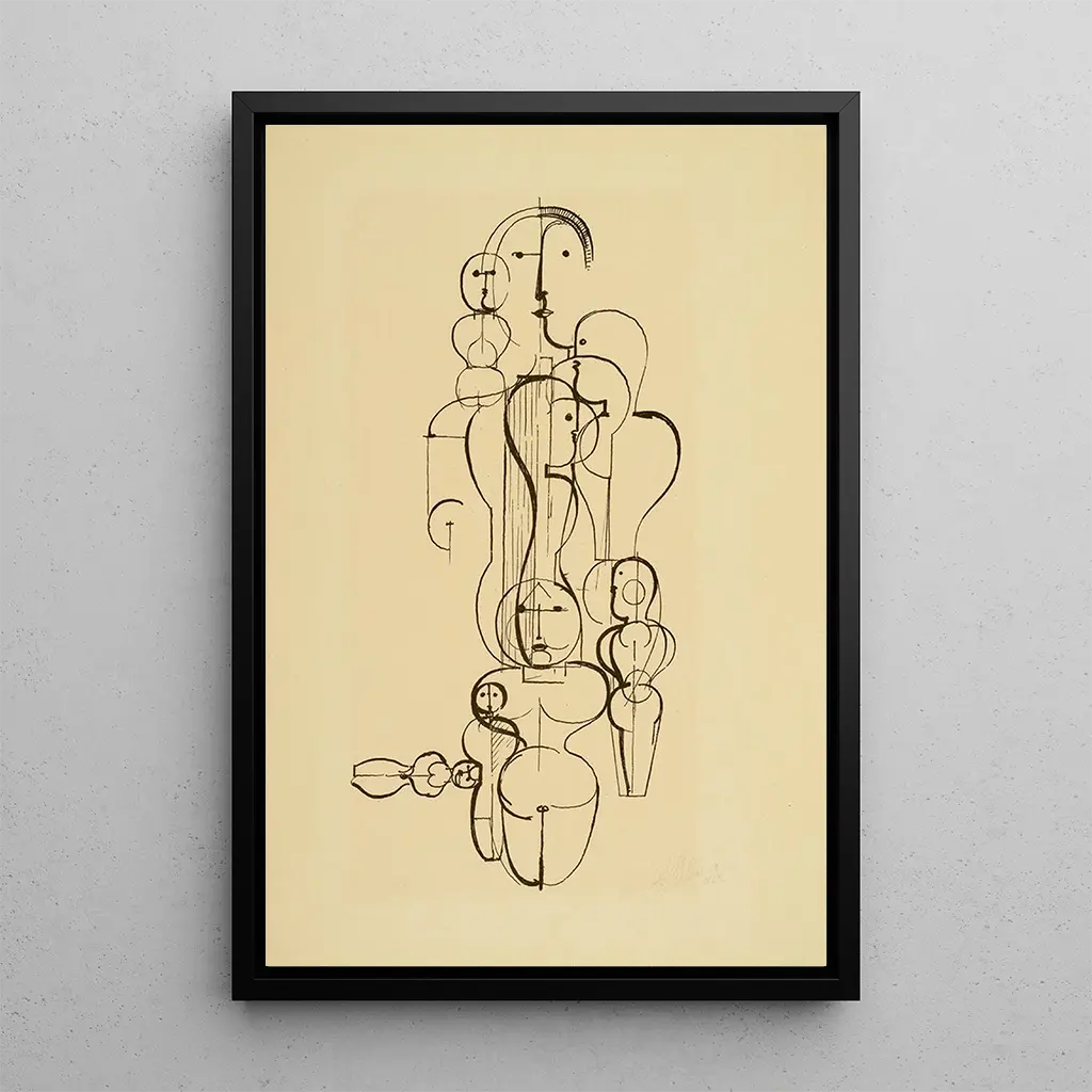 I "Plan de groupe concentrique K1" bjuder Oskar Schlemmer in oss att utforska en värld där geometriska former flätas samman i en fängslande visuell harmoni. Cirklar, trianglar och rektanglar överlappar varandra och skapar en dynamisk komposition som tycks vibrera under effekten av livfulla färger. Schlemers teknik, som kombinerar målning och abstraktion, ger upphov till en atmosfär som är både lekfull och eftertänksam, där varje element hittar sin plats i en visuell balett. Denna konsttryck, en sann hyllning till moderniteten, för oss in i en reflektion över rummet och rörelsen, och transcenderar de enkla formerna för att framkalla en kollektiv dans.