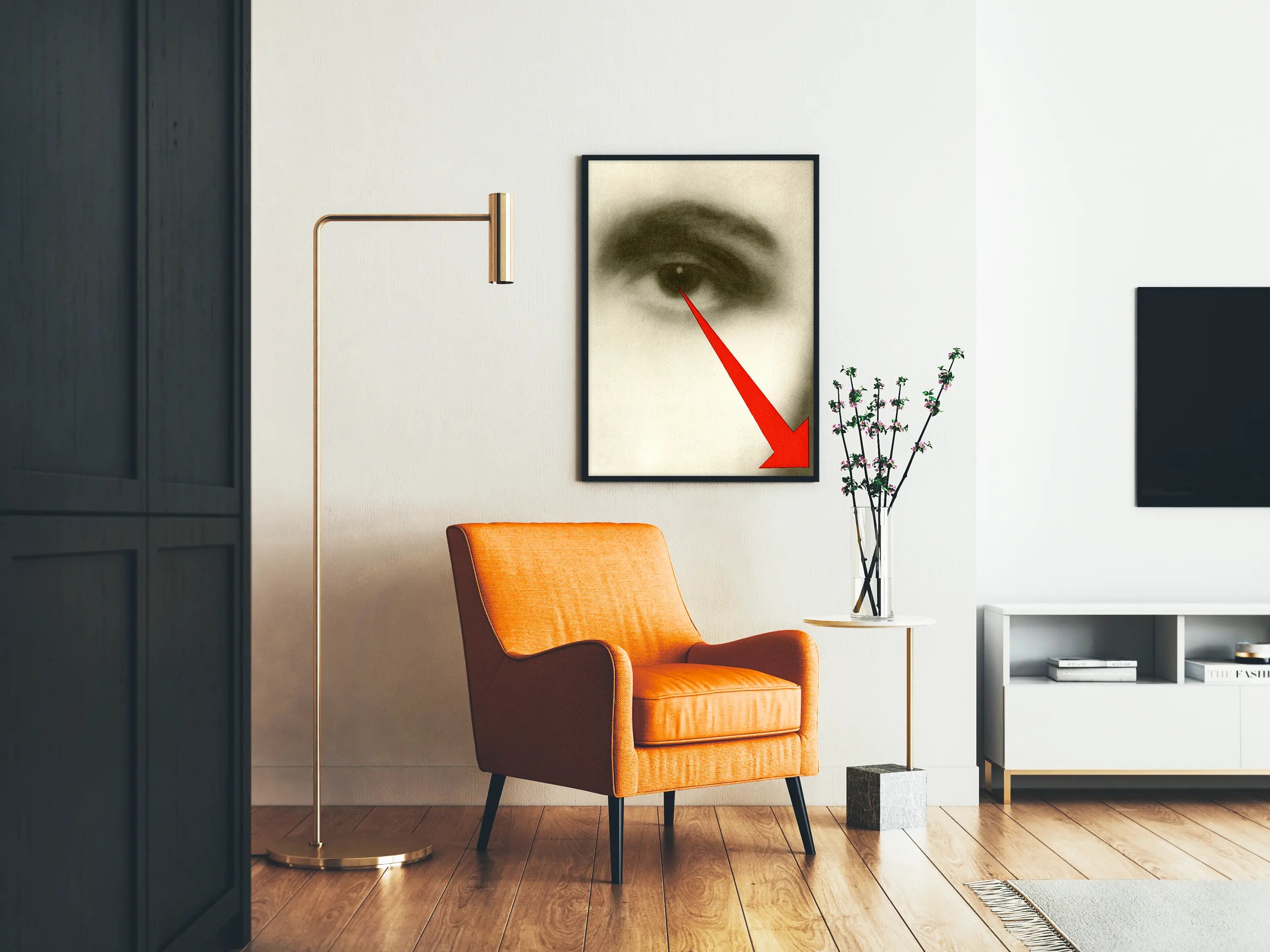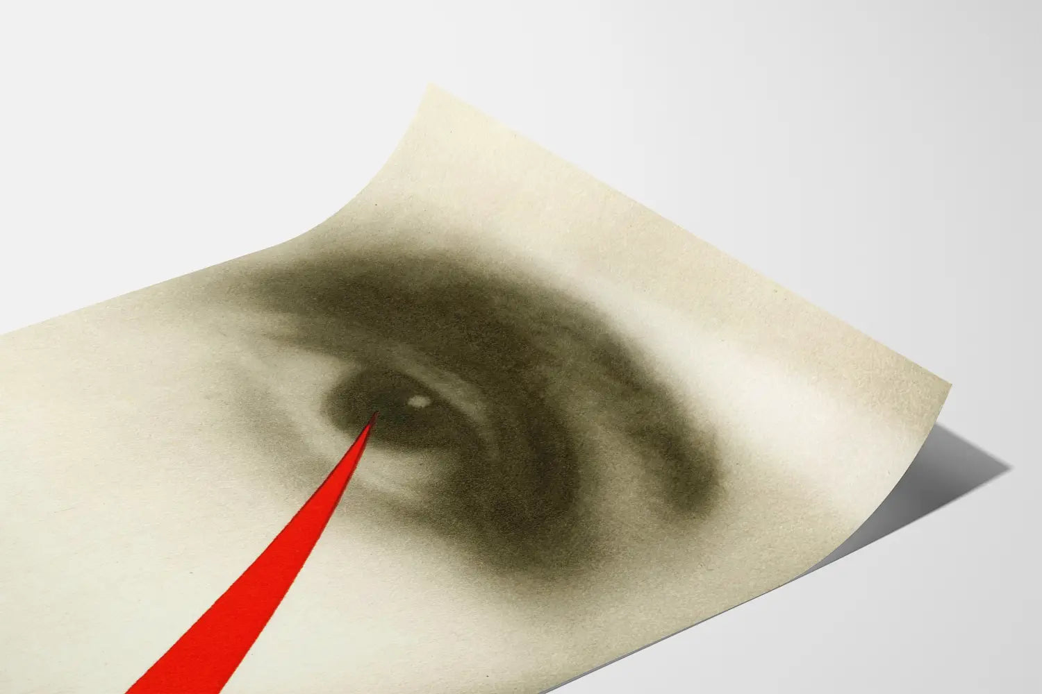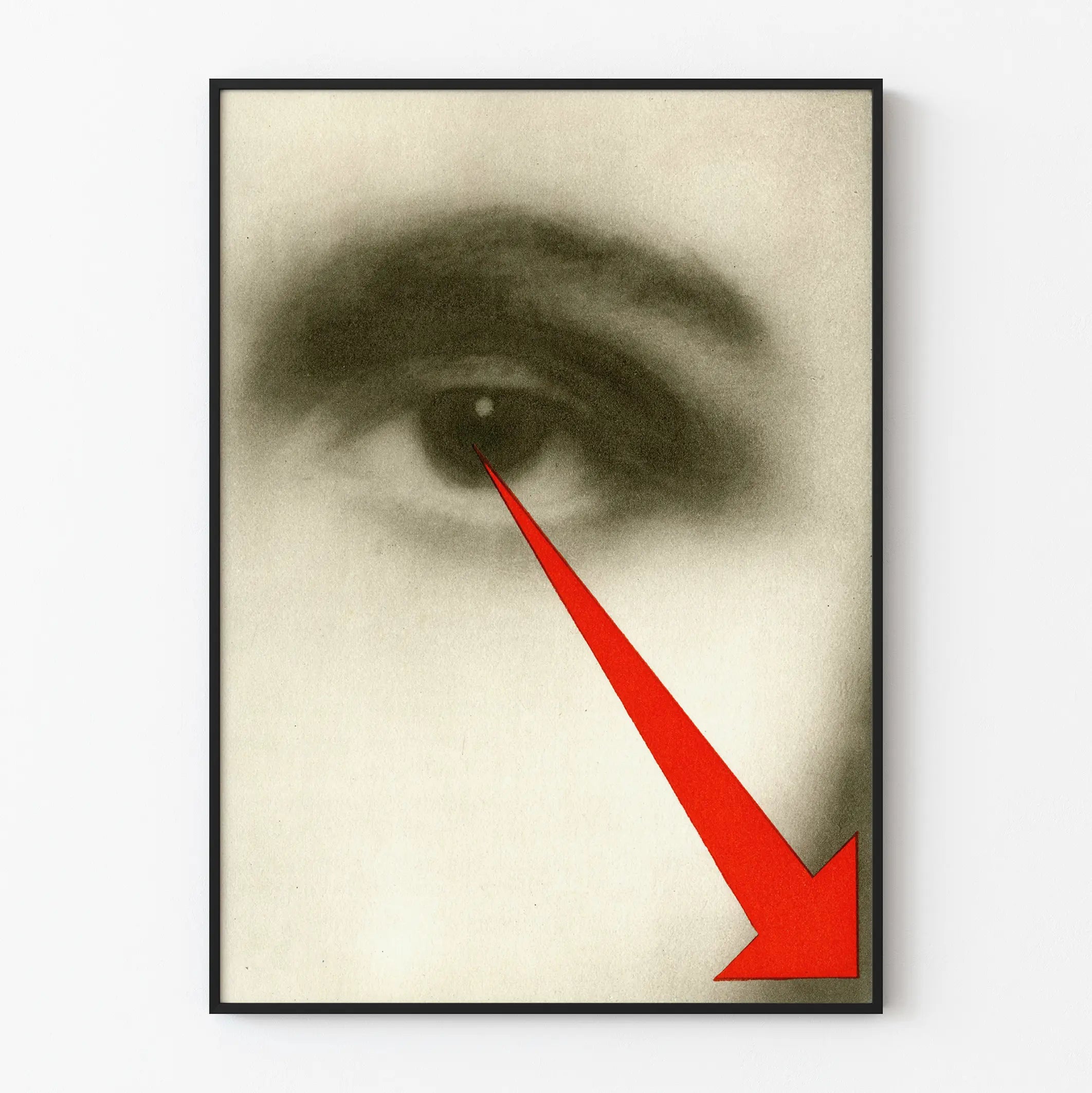 Denna affisch erbjuder en stark visuell komposition med ett närbild på ett öga i grå nyanser, som fångar uppmärksamheten tack vare en ljusröd pil som pekar nedåt till höger. Den slående kontrasten mellan ögats monokroma färg och den livfulla röda pilen skapar en kraftfull visuell dynamik, perfekt för en modern och uttrycksfull väggdekoration. Denna poster är idealisk för att tillföra en konstnärlig och samtida touch till vilket inomhusrum som helst, oavsett om det är ett vardagsrum, ett kontor eller en konstgalleri. Enkelheten i formerna och den begränsade men intensiva färgpaletten förstärker den visuella effekten, vilket skapar en atmosfär som är både mystisk och fängslande. Den fokuserade blicken i ögat, tillsammans med riktningen markerad av den röda pilen, inbjuder till reflektion eller visuell utforskning. Denna väggbild passar särskilt för entusiaster av minimalistisk och grafisk konst, som vill ha ett stycke som väcker nyfikenhet och fångar betraktarens uppmärksamhet. Använd som ett centralt konstverk eller integrerat i en balanserad väggkomposition, anpassar sig denna poster till olika dekorativa upplägg. Kvaliteten på trycket framhäver de subtila detaljerna i ögat och den klara mättnaden av rött, vilket garanterar hållbarhet och skärpa över tid. Denna affisch är ett utmärkt val för den som vill berika sin omgivning med ett väggdekorationselement som är både sober och kraftfull, och som kombinerar grafik med visuellt symbolik.