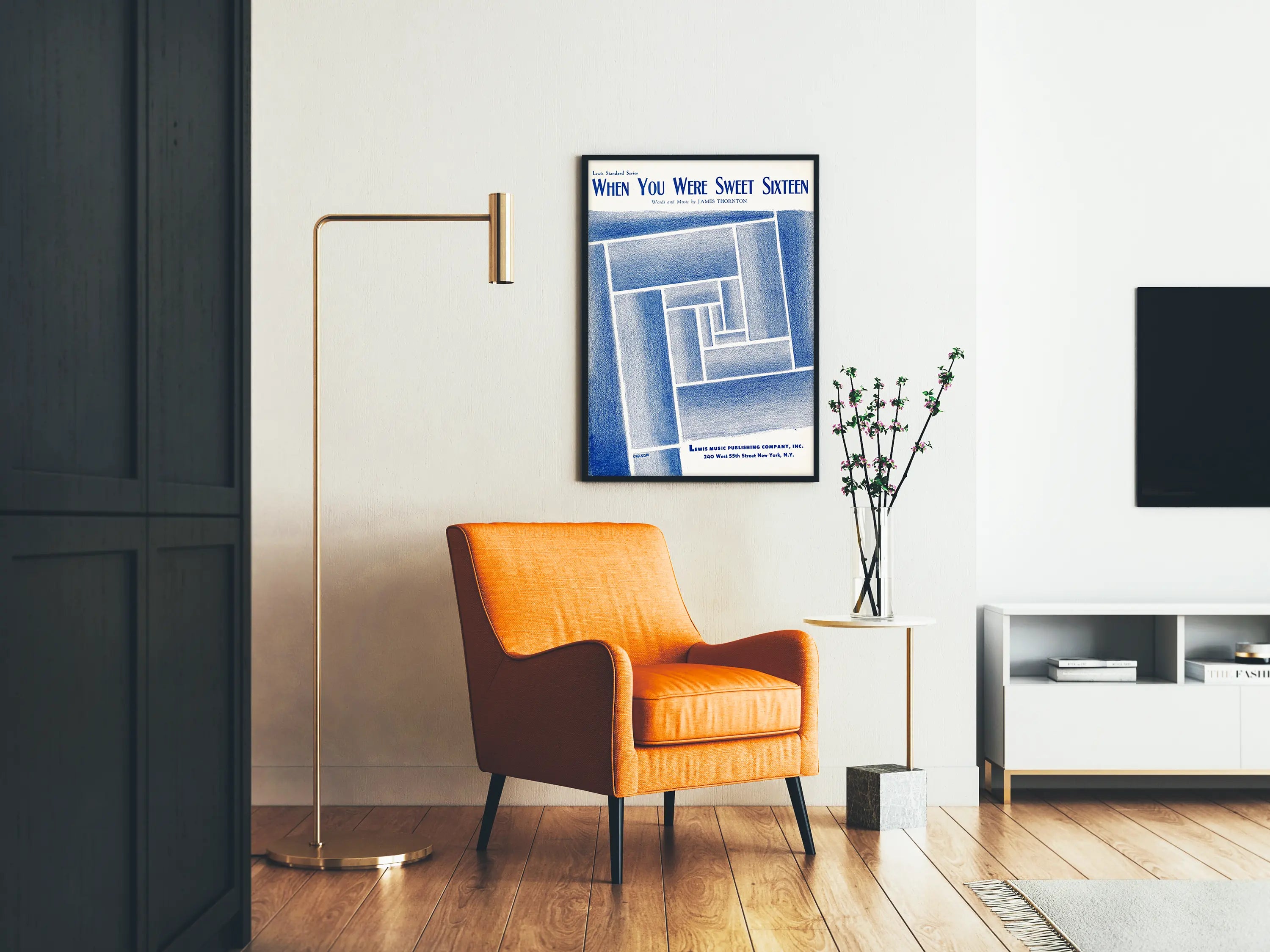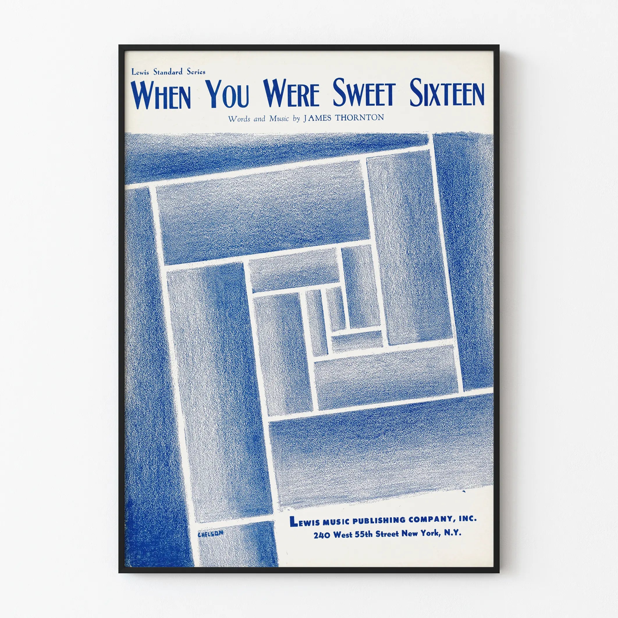 På en ljus bakgrund framhäver denna affisch en ren och texturerad grafisk stil som fångar ögat utan att vara överväldigande. Den mörkblå texten "When You Were Sweet Sixteen" längst upp på affischen, samt noteringen "Words and Music by James Thornton", understryker dess musikaliska ursprung samtidigt som den tillför en poetisk dimension till inredningen. Visuellt inkluderar den även signaturen "Chelson" i det nedre vänstra hörnet, vilket bekräftar det konstnärliga och omsorgsfulla arbetet från skaparen.