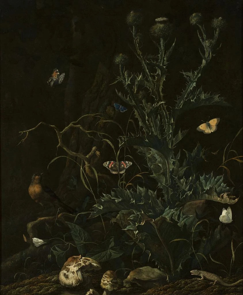 Denna målning utmärker sig genom sin virtuosa användning av ljus och skuggor, karaktäristiskt för barockstilen. Begeyn vet hur man leker med kontraster för att ge liv åt sina motiv, vilket gör varje tistel nästan påtaglig, varje fjäril ömtålig och varje ödla vibrerande. Färgerna, både livfulla och subtilt nyanserade, skapar en atmosfär som är både lugn och dynamisk. Valet av tistlar, ofta betraktade som vanliga växter, är ett bevis på konstnärens vaksamma öga för skönheten i det vardagliga. Genom att integrera dessa element i sin komposition höjer Begeyn naturen till en konstnärlig nivå som fascinerar och förundrar. Placeringen av motiv, med en perfekt balans, vittnar om en oöverträffad teknisk skicklighet, där varje detalj är noggrant utarbetad för att bidra till den totala harmonin i verket.