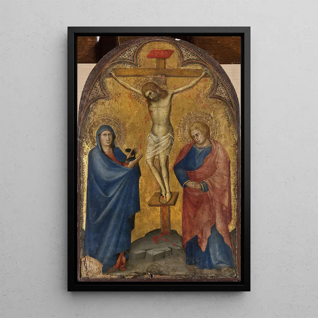 Konsttrycket av Andrea di Bartolos Crucifixion skildrar med stark känslomässig intensitet den tragiska scenen av Kristi offer. De mörka färgerna och nyanser av rött framkallar smärta och lidande, medan soldaternas och vittnenas figurer återges med slående realism. Kompositionen är noggrant balanserad, varje element är placerat för att leda blicken mot verkets centrum, där Kristus är hängd på korset. Atmosfären är tung av allvar, vilket inbjuder betraktaren att reflektera över teman som tro och försoning.