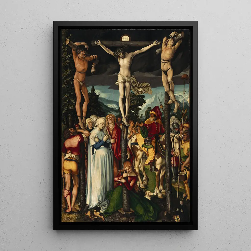La Crucifixion du Christ är ett gripande konsttryck som fångar själva essensen av mänskligt lidande och gudomlig försoning. I denna målning använder Hans Baldung mörka färger och slående kontraster för att förstärka scenens emotionella intensitet. Figurerna är återgivna med stor uttrycksfullhet, varje ansikte vittnar om djup smärta. Kompositionen, centrerad kring L korsfäste, är omgiven av karaktärer som uttrycker ett spektrum av känslor, från sorg till förtvivlan. Atmosfären är tung, nästan påtaglig, och inbjuder betraktaren att reflektera över offret och tron.
