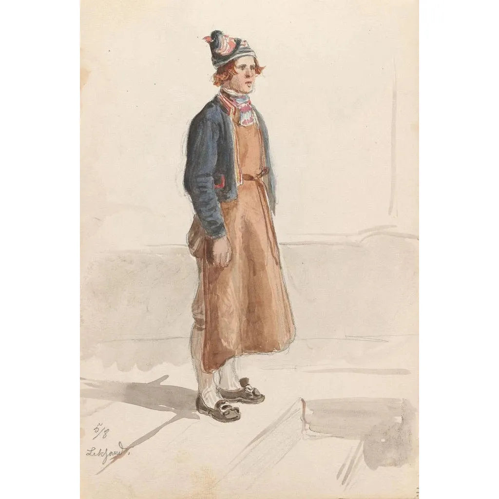 Konsttrycket "Studie av kostym Leksand" av Adolph Tidemand fördjupar oss i den färgstarka och rika världen av svenska folkdräkter. Med livfulla nyanser av rött, blått och gult fångar Tidemand själva essensen av Leksands kulturarv. Konstnärens precisa teknik, som kombinerar akvarell och teckning, skapar en levande och dynamisk atmosfär, nästan kännbart. De minutiösa detaljerna i broderier och mönster vittnar om ett hantverksmässigt kunnande och bjuder in betraktaren att uppskatta skönheten i de dräkter som bärs vid lokala festligheter. Denna konsttryck är mycket mer än en enkel avbildning; den är en hyllning till kulturella rötter och traditioner.