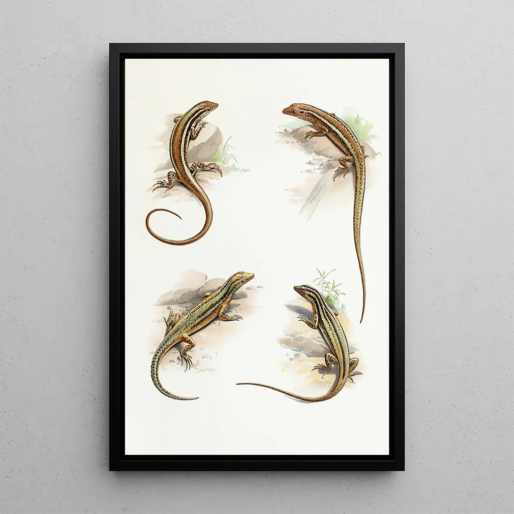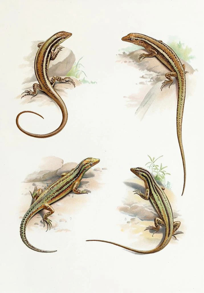 I detta konsttryck av Cryptoblepharus fångar konstnären Thomas Barbour den fascinerande essensen av denna reptil. De minutiösa detaljerna i huden, med dess noggrant återgivna fjäll, skapar en nästan levande atmosfär. Skiftningarna av grönt och brunt blandas harmoniskt och återspeglar djurets naturliga habitat. Ljuset leker över ytorna och framhäver texturen och djupet i verket. Barbour lyckas förmedla en känsla av lugn och nyfikenhet, inbjudande betraktaren att betrakta den ofta förbisedda skönheten hos reptildjuren.
