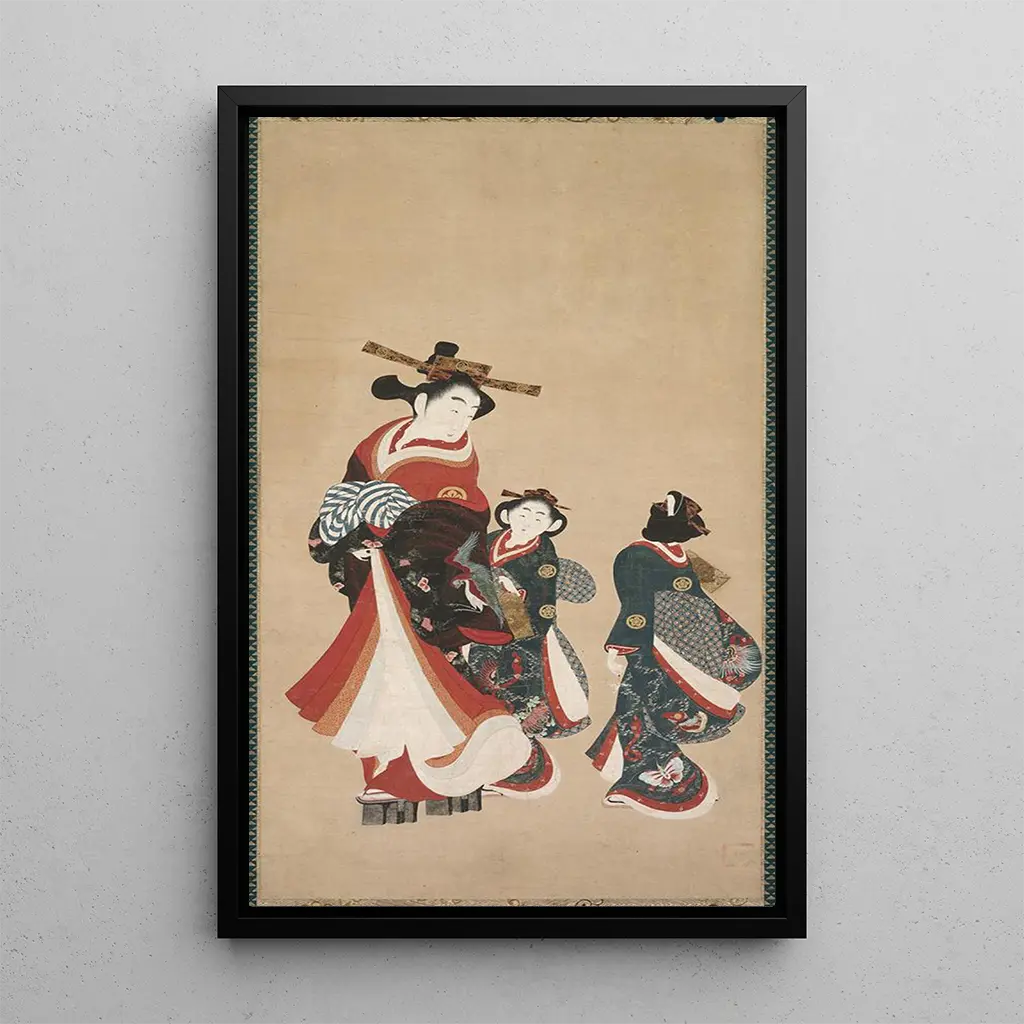 Courtisane och tjänare: en intim scen ur vardagslivet Konsttrycket av "Courtisane och tjänare" av Engetsud är ett verk som fördjupar betraktarens upplevelse i ett ögonblicks intimitet, fångat med fin känsla. Personerna, klädda i färgglada kimonos, rör sig med grace i ett rikt dekorerat interiör. Nyansen av rött, blått och guld blandas för att skapa en varm och välkomnande atmosfär. Tekniken att måla på siden, typisk för japansk konst, ger denna duk en unik, nästan taktil textur som inbjuder till visuell utforskning av de minutiösa detaljerna i kostymer och accessoarer. Engetsud: en mästare av japansk ukiyo-e Engetsud, en anonym konstnär från 1700-talet, är erkänd för sina ukiyo-e-tryck som illustrerar vardagslivet och nöjena under Edo-perioden. Påverkad av japanska konsttraditioner har han fångat den flyktiga skönheten hos kurtisaner och scener från stadslivet. Hans verk vittnar om en teknisk skicklighet och en estetisk känslighet som präglade hans tid. Även om det är få biografiska detaljer tillgängliga om hans liv, lever hans arv vidare genom hans skapelser, som fortsätter att inspirera konstälskare världen över. En dekorativ investering med många fördelar Konsttrycket av "Courtisane och tjänare" är ett perfekt val för den som vill tillföra en exotisk touch till sin inredning. Oavsett om det är i ett vardagsrum, ett sovrum eller ett kontor, kommer denna duk att skapa en lugn och sofistikerad atmosfär. Dess reproduktionskvalitet garanterar trohet mot färger och detaljer i originalverket, samtidigt som den erbjuder en obestridlig estetisk attraktion. Genom att integrera detta verk i ditt utrymme skapar du en inspirerande och elegant miljö, som inbjuder till eftertanke och flykt.