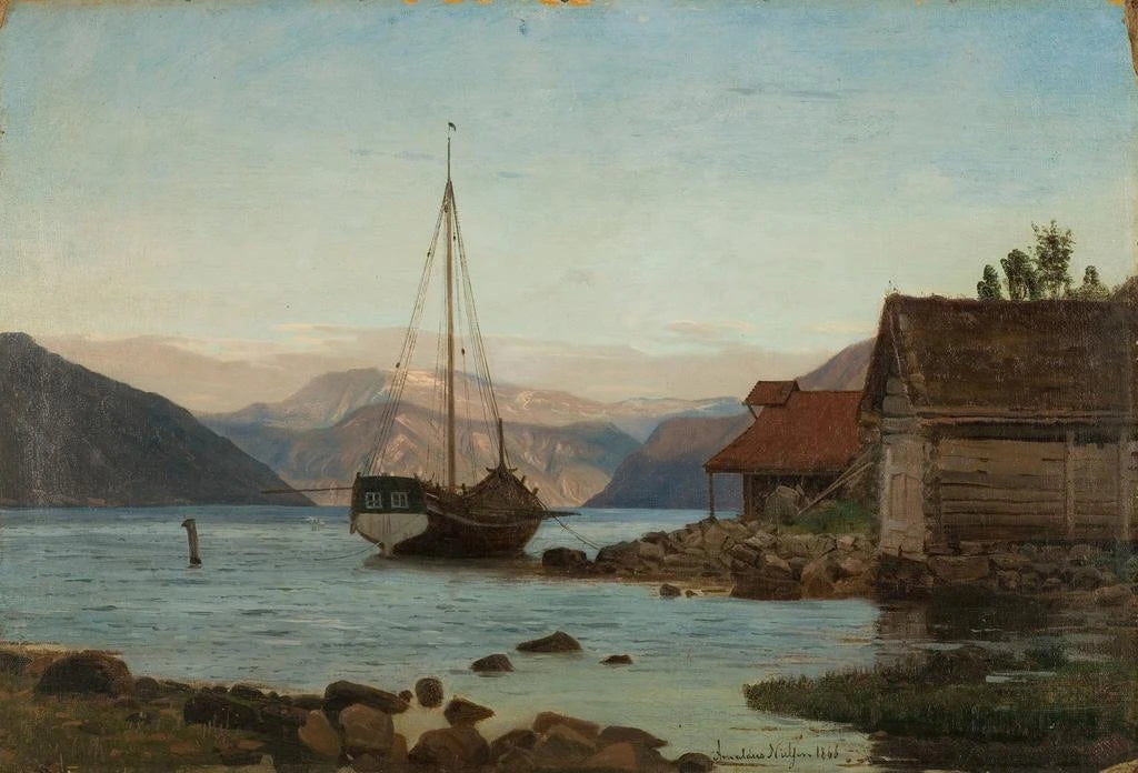 "Soirée i Balestrand" fångar essensen av en lugn skymning, där himlen tonar i gyllene och lila nyanser. Reflektionerna på vattnet, varsamt återgivna med flytande penseldrag, skapar en atmosfär av lugn och dröm. Konstnären lyckas förmedla en känsla av stillhet, nästan meditativ, och bjuder in betraktaren att fördjupa sig i denna idylliska scen. Den balanserade kompositionen mellan jord och himmel, samt den subtila användningen av ljus, gör detta konsttryck till ett verkligt mästerverk inom landskapsmåleri.