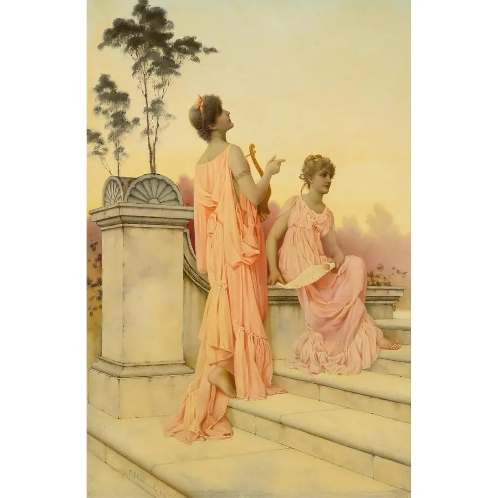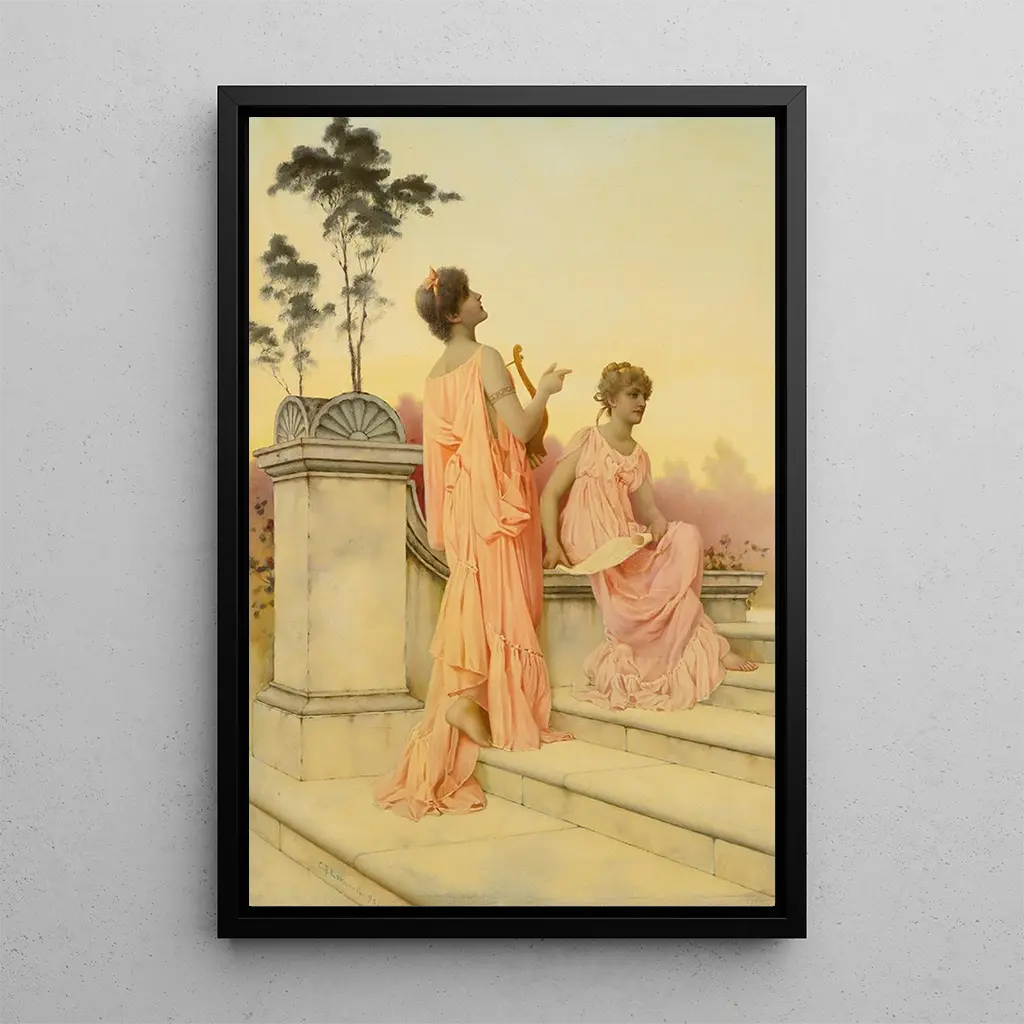"Chant du soir" av Charles Frederick Lowcock är ett förtrollande konsttryck som väcker känslan av en lugn skymning. Tavlan skildrar ett landskap där de varma färgerna från dagens slut harmoniskt blandas, vilket skapar en atmosfär av lugn och eftertanke. Nyansen av orange, lila och blå smälter mjukt samman, medan silhuetterna av träden majestätiskt reser sig och ger djup åt scenen. Lowcocks teknik, som kombinerar realism och impressionism, gör det möjligt att känna av den mjuka stämningen, som en inbjudan att förlora sig i naturens skönhet.