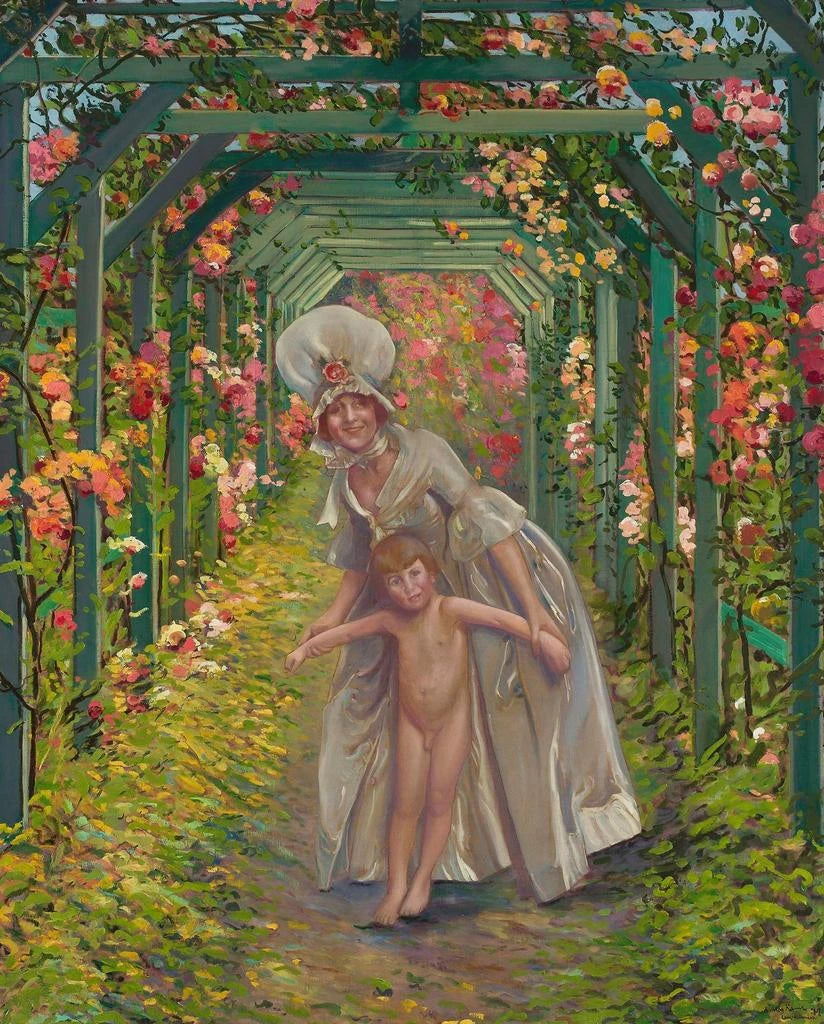 Målning av en kvinna med en naken pojke på sommaren - Léon Kamir - Kaufmann | Konsttryck