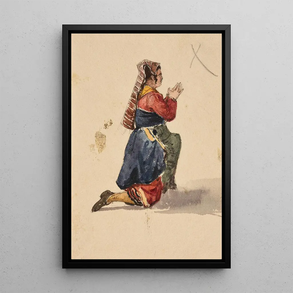 "Studie av knäböjd kvinna" av Jacques-Raymond Brascassat skildrar en kvinnlig figur i en pose fylld av mildhet och lugn. De delikata kurvorna och de noggranna detaljerna i klänningen framhäver skönheten och sårbarheten i kvinnligheten. Den färgpalett som konstnären valt, med varma och lugnande toner, skapar en intim och eftertänksam atmosfär. Denna konsttryck inbjuder till reflektion över kvinnans villkor, samtidigt som den hyllar hennes grace och elegans, och fångar ett ögonblick av sårbarhet och styrka.