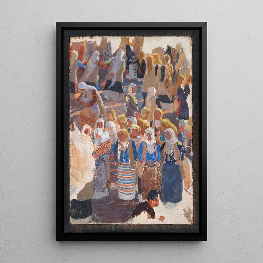 Konsttrycket Grupp av dansande kvinnor i Megara av Niels Skovgaard visar en livfull scen där flera kvinnor deltar i en kollektiv dans. De flytande och synkroniserade rörelserna hos dansarna skapar en fängslande dynamik, medan de lysande färgerna, från rött till grönt, tillför en smittsam energi till verket. Skovgaards teknik, som kombinerar realism och impressionistiska inslag, gör det möjligt att känna glädjen och exuberansen i detta festliga ögonblick. Varje ansikte, varje gest är noggrant återgiven, vilket bjuder in betraktaren att fördjupa sig i dansens värld.