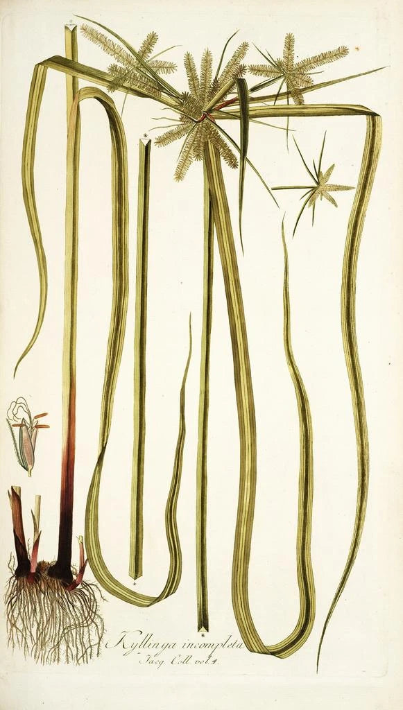 Kylinga incompleta, ett ikoniskt konsttryck av Nikolaus Joseph Freiherr von Jacquin, fångar själva essensen av exotisk flora med en oöverträffad känsla för detaljer. De livfulla färgerna i detta konsttryck framkallar rikedomarna i tropiska landskap, där varje detalj är noggrant återgiven. Akvarelltekniken, som används av Jacquin, ger duken en lätthet och flytande känsla, vilket tillåter de organiska formerna att blomstra på papperet. Atmosfären som utstrålar av detta konstverk är både lugn och fascinerande, och inbjuder betraktaren att fördjupa sig i en frodig växtvärld.
