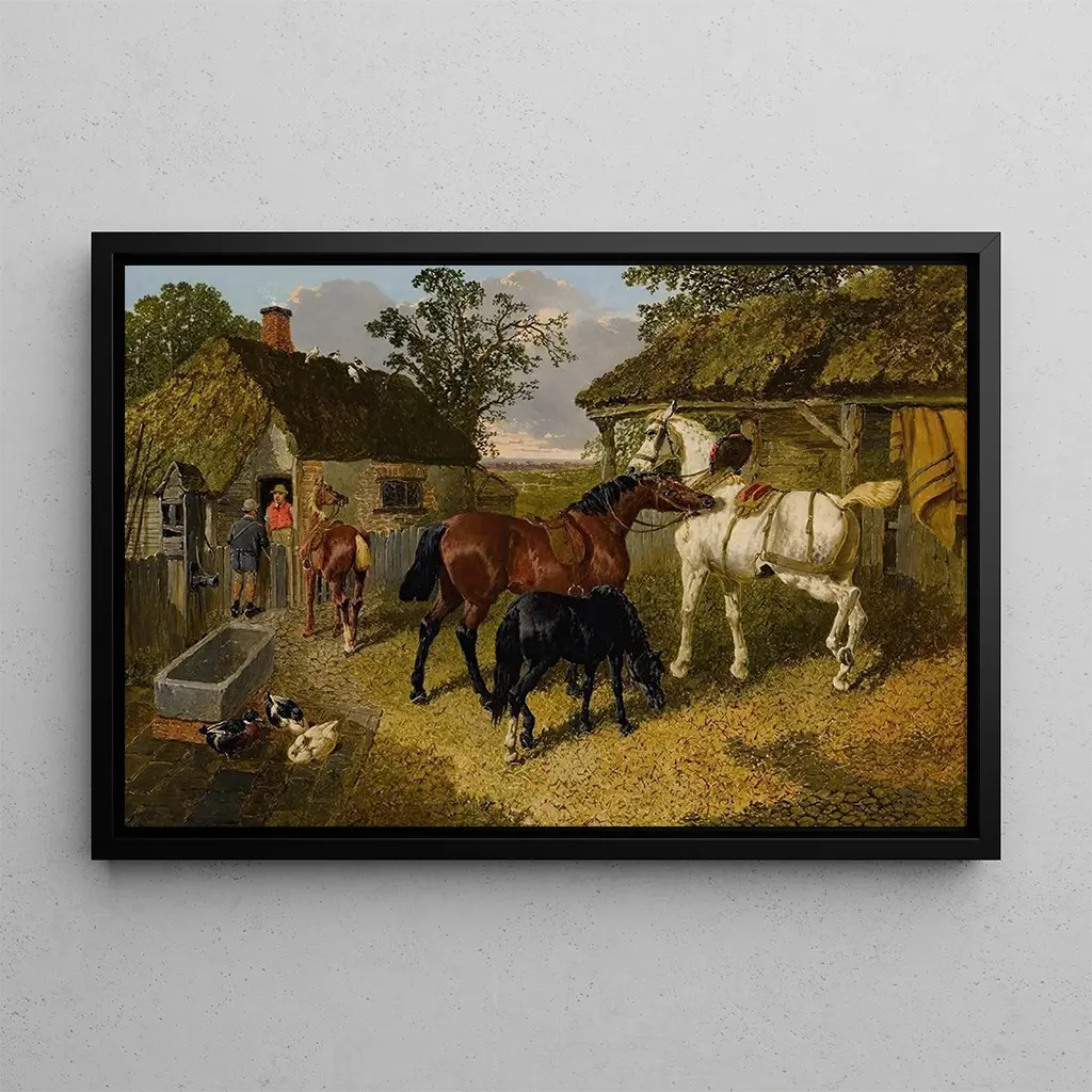 La reproduction La Cour de l'écurie de John Frederick Herring le Jeune capture un moment vivant et dynamique de la vie à la ferme. Les couleurs terreuses et les détails minutieux des animaux et des personnages plongent le spectateur dans une scène animée où l'activité quotidienne se déroule sous un ciel lumineux. La technique de Herring, qui mêle réalisme et sensibilité, permet de ressentir l'énergie de cette cour, où chaque élément, des chevaux aux paysans, semble prendre vie. Ce tableau évoque une nostalgie pour un mode de vie simple et authentique, tout en célébrant la beauté du monde rural.