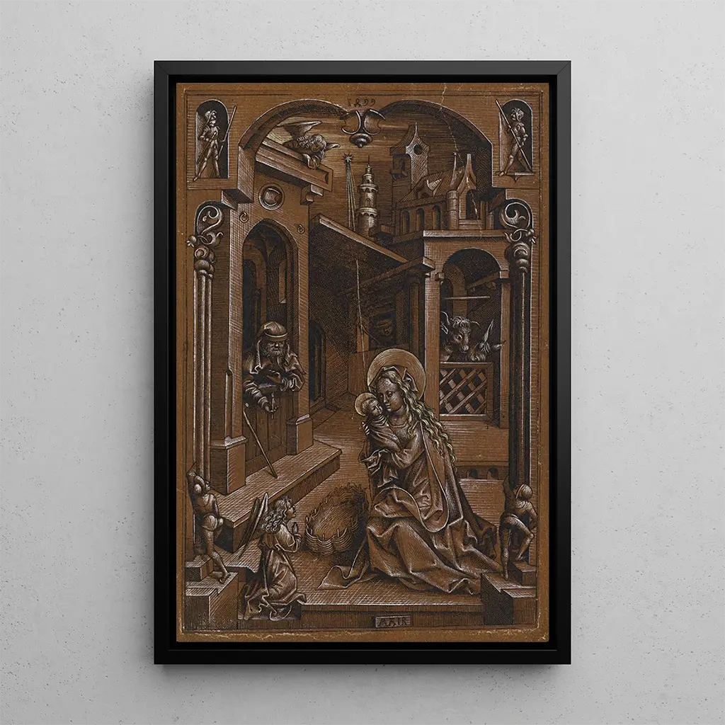 "Konsttryck" av Mair von Landshut är ett ikoniskt verk som illustrerar den heliga scenen av Jesu födelse med en slående känslomässig djup. Kompositionen, rik på detaljer, skildrar Jungfru Maria, helige Josef och Jesusbarnet i en ödmjuk men ljus stuga. De varma färgerna, från glänsande guld till jordnära bruna, skapar en atmosfär av fred och lugn. Konstnärens teknik, kännetecknad av noggrann realism, gör det möjligt att känna den ömhet och fromhet som utstrålar från denna bibliska scen, och bjuder in betraktaren till en andlig eftertanke.