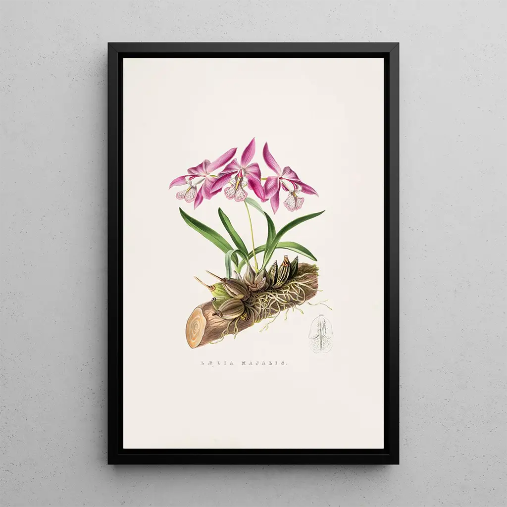 Laelia Majalis, ett fängslande konsttryck av James Bateman, framkallar elegansen och ömtåligheten hos exotiska blommor. Den blomsterkomposition, rik på detaljer, använder en palett av livfulla och naturliga färger, från nyanser av lila till ljusa vita inslag. Akvarelltekniken gör det möjligt att återge genomskinligheten hos kronbladen, vilket skapar en lätt och luftig atmosfär. Varje element i denna målning tycks dansa under ljuset, inbjudande betraktaren att fördjupa sig i en förtrollande blomstervärld, där naturens skönhet lyfts fram med en anmärkningsvärt precision.