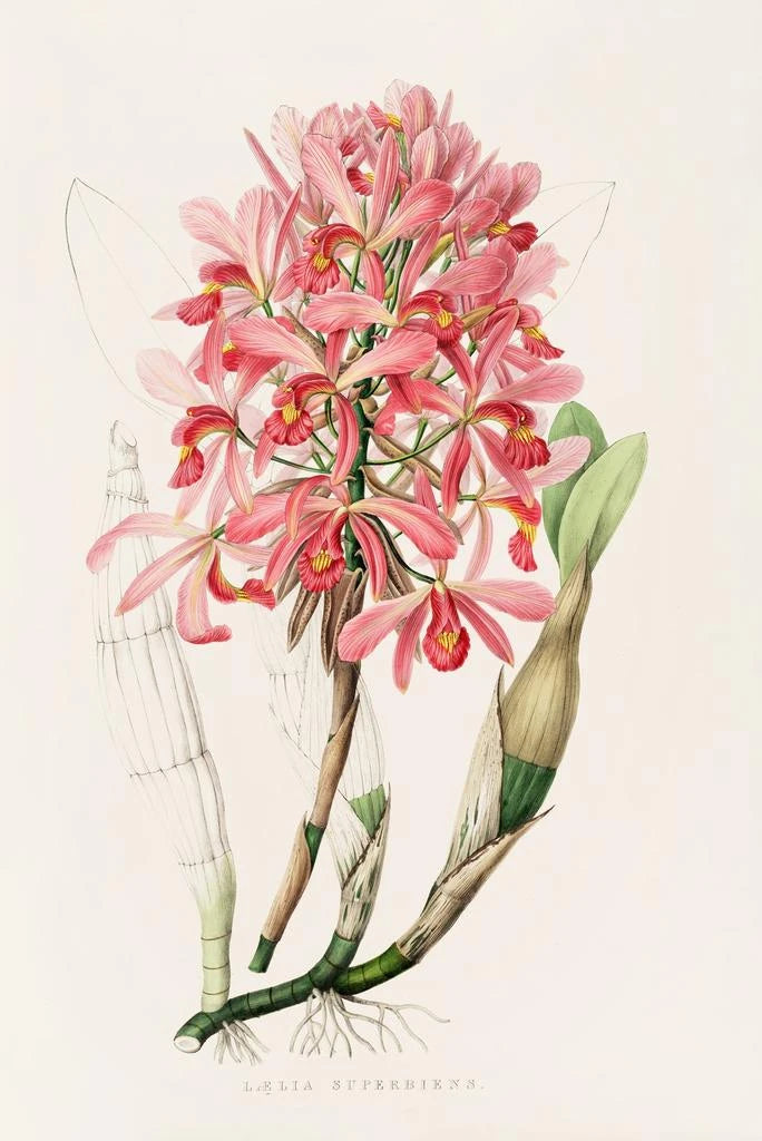 Laelia Superbiens, ett ikoniskt konsttryck av James Bateman, utmärker sig genom sin glans och sin rika färgskala. Denna tavla visar en frodig blomsterkomposition, där de livfulla nyanserna av rosa, gult och grönt smälter samman harmoniskt. Akvarelltekniken, som används med mästerlighet, fångar ljuset och texturen på blombladen, vilket skapar en livfull och glad atmosfär. Varje blomma tycks komma till liv och bjuder in betraktaren att uppskatta naturens flyktiga skönhet, samtidigt som den hyllar den växtliga mångfalden.
