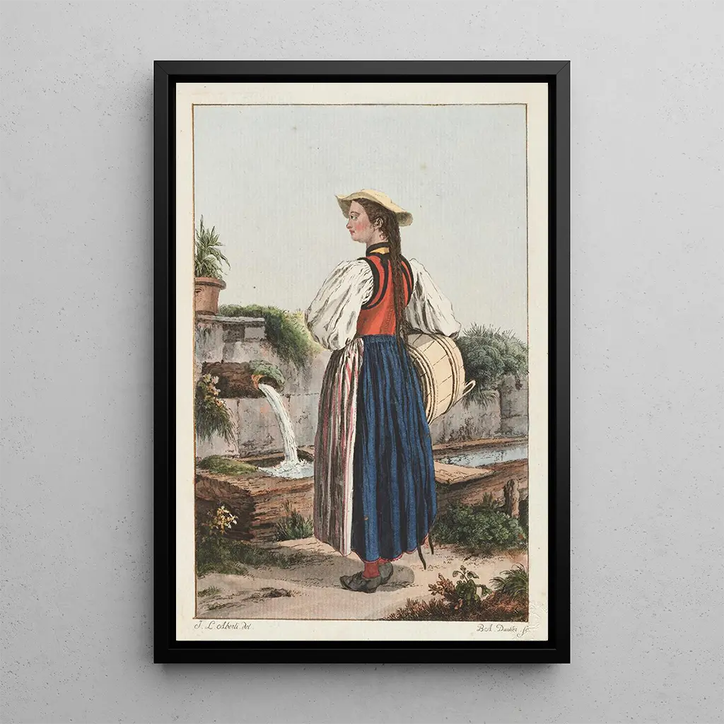 La konsttryck av duken "Paysanne des environs de Berne" av Johann Ludwig Aberli framkallar en idyllisk scen med en känsla av frid. De mjuka och naturliga färgerna, dominerade av lugnande gröna och jordnära nyanser, fördjupar betraktarens intryck av ett typiskt schweiziskt landskap. Tekniken med akvarell, använd med fin precision, fångar ljuset och atmosfären från denna tid. Den landsbygdskvinnan, avbildad med värdighet, tycks ägna sig åt sina dagliga sysslor, vilket symboliserar enkelheten och skönheten i livet på landet. Detta konsttryck inbjuder till en lugn reflektion och avslöjar djupet i det rurala livet under 1700-talet.