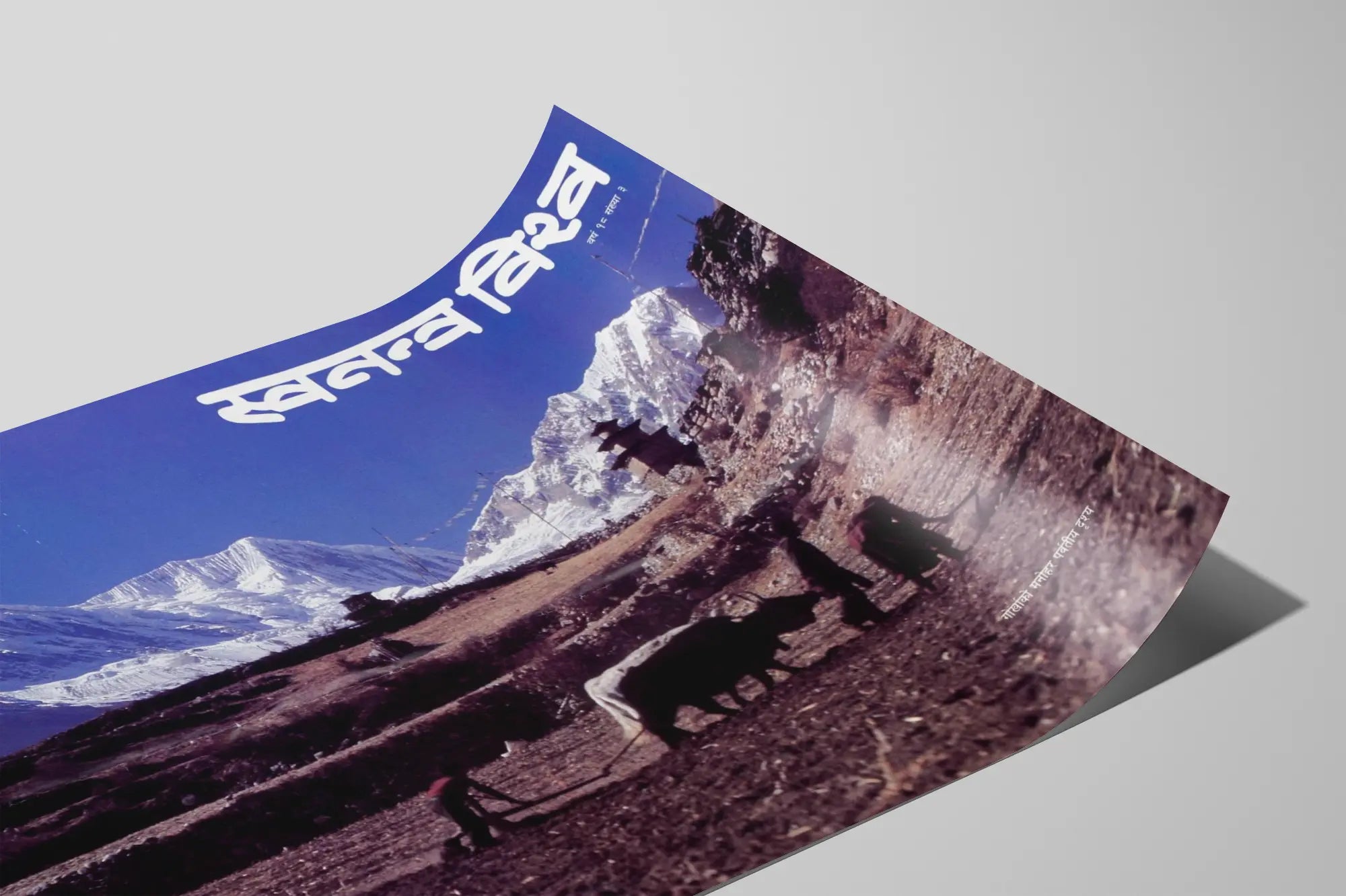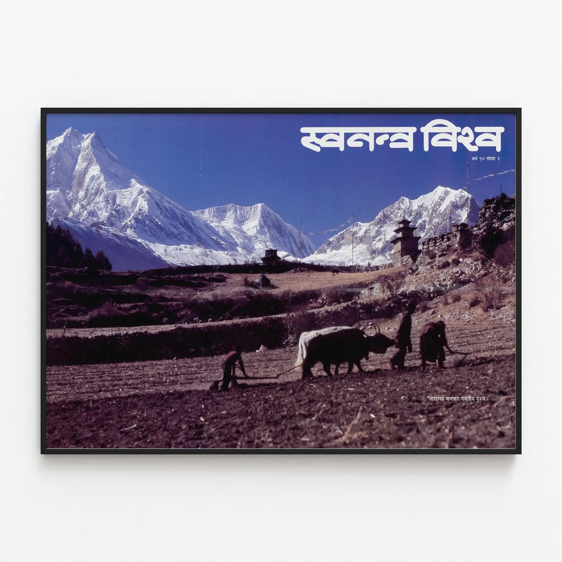 Upptäck detta väggdekorationsaffisch som fångar ett spektakulärt bergslandskap, där bönder arbetar på en åker tillsammans med oxar. Denna affisch illustrerar en naturlig miljö präglad av dominerande snötäckta toppar, samt traditionella stenbyggnader som tillför en äkta charm till scenen. Himlen är djupt blå, vilket förstärker bergens renhet och höjd. I förgrunden framhävs jordbruksverksamheten, som är avgörande för det lokala livet, med en trogen skildring av gammaldags plöjning, vilket skapar en stark koppling mellan natur och kultur. Denna affisch, perfekt för väggdekoration med teman som natur, landsbygd och bergslandskap, ger en lugn och inspirerande atmosfär i vilket rum som helst. Den är ett utmärkt val för dem som uppskattar bilder som berättar en historia om arbete, tradition och naturlig skönhet. Denna väggmålning är idealisk för ett vardagsrum, en hall eller ett kontor, där den kan inbjuda till eftertanke och kulturell upptäcktsfärd. Balansen mellan de mörka nyanserna i förgrunden och de ljusa, klara tonerna av bergen i bakgrunden gör denna affisch särskilt harmonisk, och främjar en atmosfär av lugn och frid. Välj denna dekorativa affisch för att berika ditt hem med en etnisk och naturlig touch, som lyfter fram enkelheten och skönheten i landsbygdens bergslandskap.