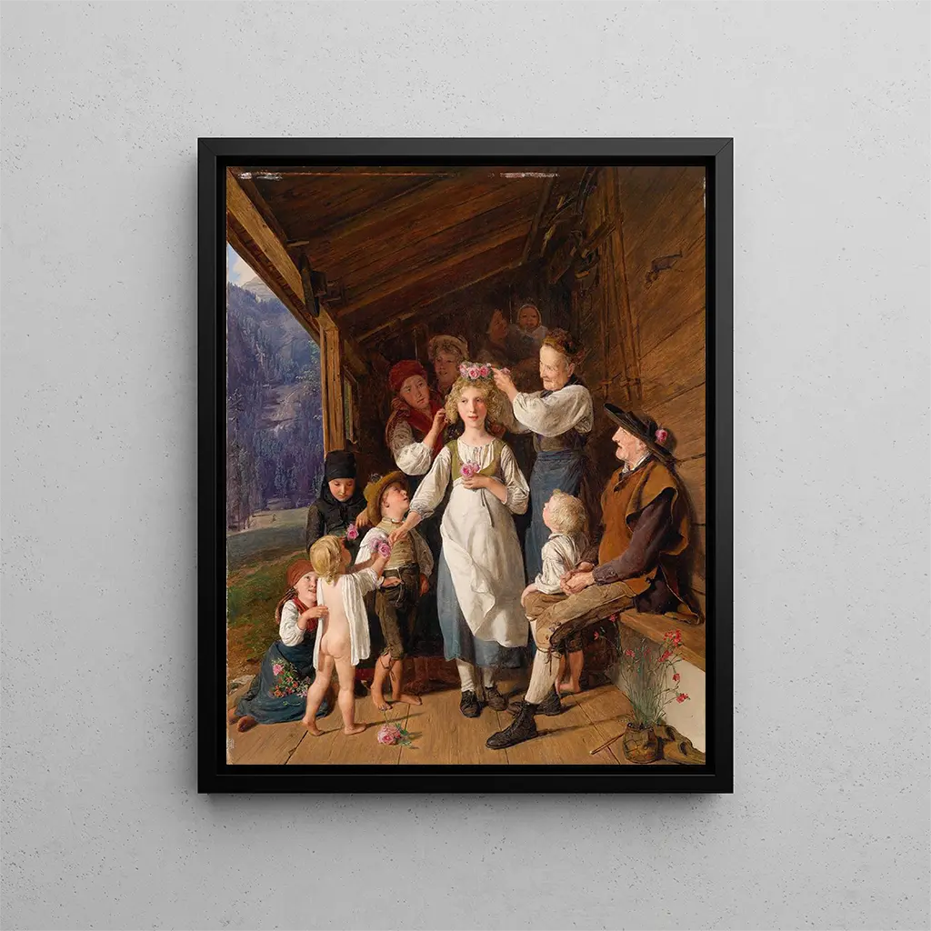 I det stora konsthistoriska panoramat utmärker sig vissa verk genom sin förmåga att fånga ögonblick av flyktbar skönhet. "Le Kranzljungfer" av Ferdinand Georg Waldmüller är ett utmärkt exempel. Denna målning, fylld av ömhet och poesi, för oss till hjärtat av en scen där naturen och mänskligheten möts i en sällsynt harmoni. Framställningen av en ung kvinna, klädd i en traditionell klänning och omgiven av blommor, väcker en hyllning till riter och folkliga traditioner. Genom detta verk bjuder Waldmüller in oss att betrakta vardagens skönhet, samtidigt som han avslöjar den mänskliga själens subtiliteter.