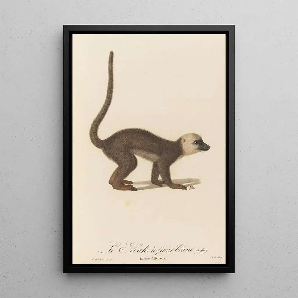 Le Maki front blanc, med sin silkeslena päls och sina livliga ögon, förkroppsligar exotism och naturens skönhet. Jean-Baptiste Audebert fångar genom detta konsttryck själva essensen av detta fascinerande djur. De livfulla färgerna och de noggranna detaljerna i pälsen skapar en levande, nästan påtaglig atmosfär. Kompositionen, noggrant balanserad, drar blickarna till sig och inbjuder till en förlängd reflektion. Varje penseldrag verkar berätta en historia, och fördjupar betraktarens värld i en plats där naturen regerar som herre.