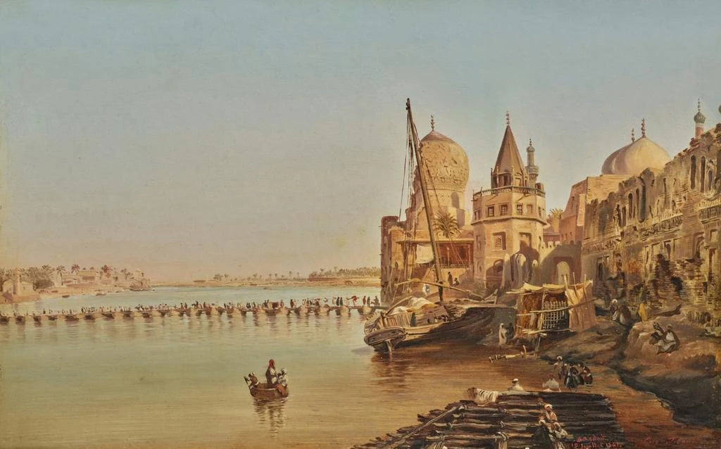 Le vieux pont de bateaux à Bagdad - Eugène Flandin