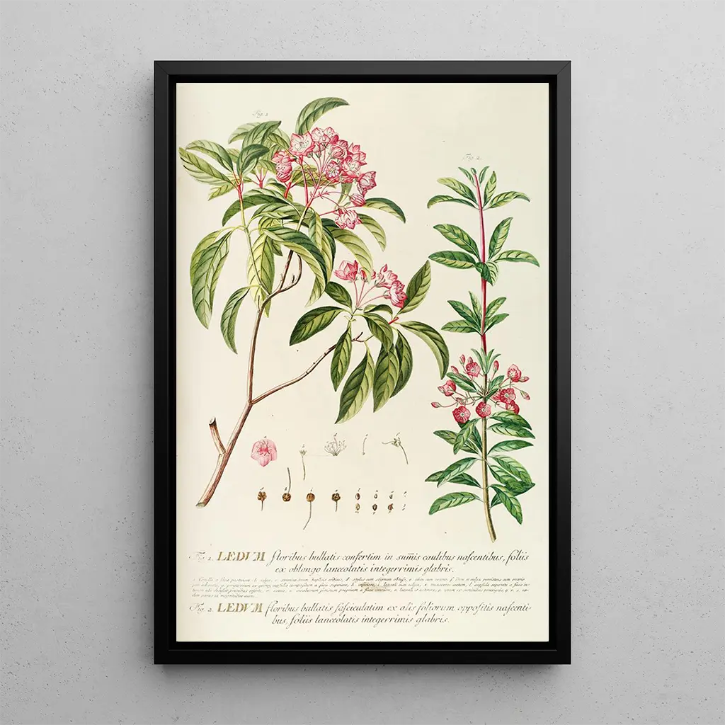 Georg Dionysius Ehrets konsttryck "Lédon" är en fascinerande skildring av naturen, där varje blomsterdetalj tycks vibrera av ett eget liv. De livfulla färgerna, från djupa gröna till delikata rosa, skapar en visuell harmoni som omedelbart fångar blickfånget. Gravyrtekniken, som behärskas av Ehret, möjliggör en exakt återgivning av texturerna på kronblad och blad, samtidigt som den tillför en atmosfär av lugn och eftertanke. Denna tavla inbjuder till en fördjupning i en frodig trädgård, där blomsterprakt blommar i ett ljusglimt.