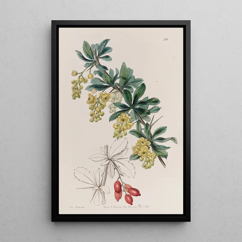 L'œuvre "L'Épine-Vinette des Tanneurs" de Sydenham Edwards se distingue par sa représentation délicate et détaillée de cette plante robuste. Les teintes riches de vert et de jaune, accentuées par des touches de rouge, créent un tableau vivant qui évoque la force de la nature. La technique d'aquarelle utilisée par Edwards permet de capturer la texture des feuilles et la forme des baies, rendant l'œuvre à la fois réaliste et poétique. L'atmosphère qui se dégage de cette toile est empreinte de sérénité, invitant le spectateur à apprécier la beauté des éléments souvent négligés du monde naturel.