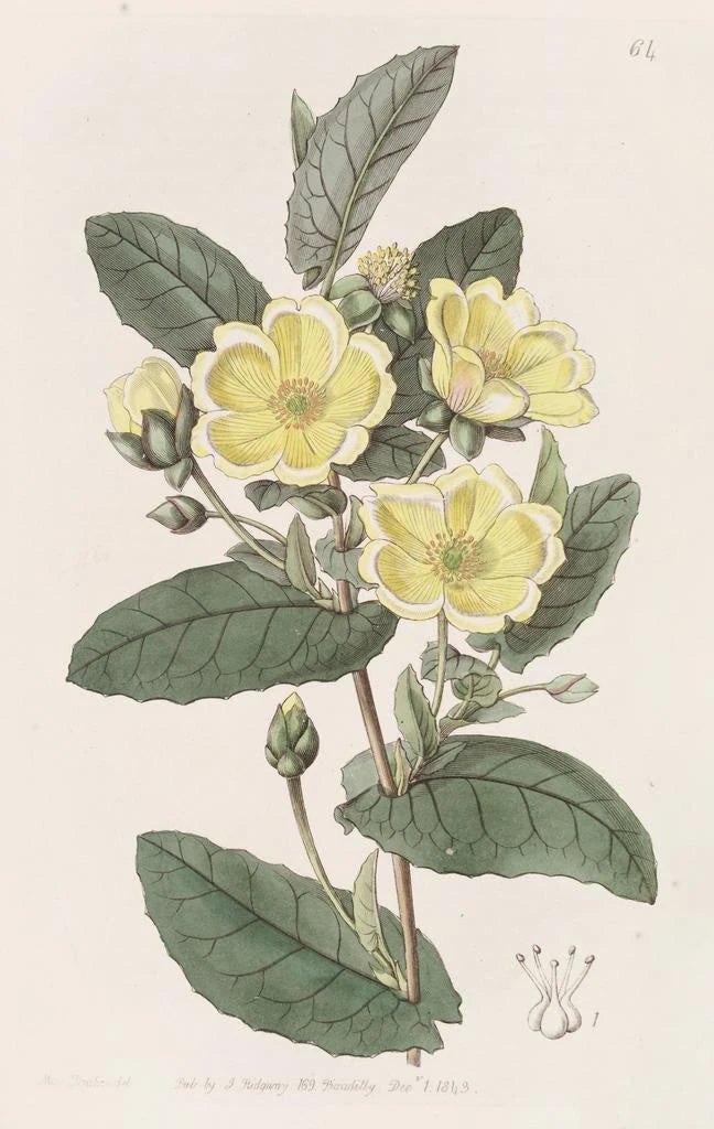 L'hibbertia Thoroughwax, med sina strålande kronblad och sin delikata struktur, är ett konsttryck som hyllar blomsterpraktens skönhet. Sydenham Edwards, genom sin mästerliga akvarellteknik, lyckas fånga ljuset och texturen i denna unika växt. Nyansen av gult och grönt blandas för att skapa en harmonisk komposition, som bjuder in betraktaren att fördjupa sig i en livfull blomstervärld. Varje detalj är noggrant återgiven, vilket ger en atmosfär som både är lugnande och inspirerande, som en promenad i en frodig trädgård.