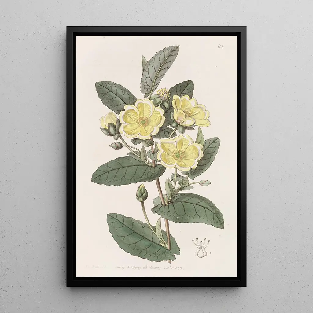 Konsttrycket av L'hibbertia Thoroughwax är ett perfekt val för att berika din inredning. Oavsett om det är i ett vardagsrum, ett kontor eller ett sovrum, tillför detta konsttryck en känsla av friskhet och färg. Dess utskriftskvalitet garanterar trohet mot detaljer och färger i originalverket, samtidigt som det tillför en estetisk dimension till ditt utrymme. Genom att välja denna canvas, väljer du ett konsttryck som inte bara förskönar ditt hem, utan också framhäver naturens rikedom och den botaniska illustrationens konst.