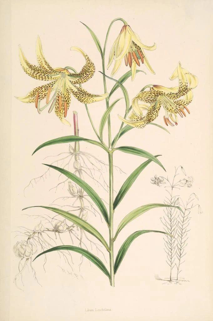 Lilium Leichtlinii, noggrant illustrerad av Walter Hood Fitch, avslöjar denna sällsynta arts prakt genom en palett av livfulla färger. Nyansen av gult och orange, subtilt nyanserade, framkallar värmen av en sommar i full blomning. Fitchs teknik, kännetecknad av en slående realism, gör det möjligt att återge varje detalj, från fläckar på blommans kronblad till bladens nervatur, med en anmärkningsvärt precision. Detta konsttryck inbjuder till en noggrann eftertanke, där varje blick avslöjar en ny aspekt av den naturliga skönheten.