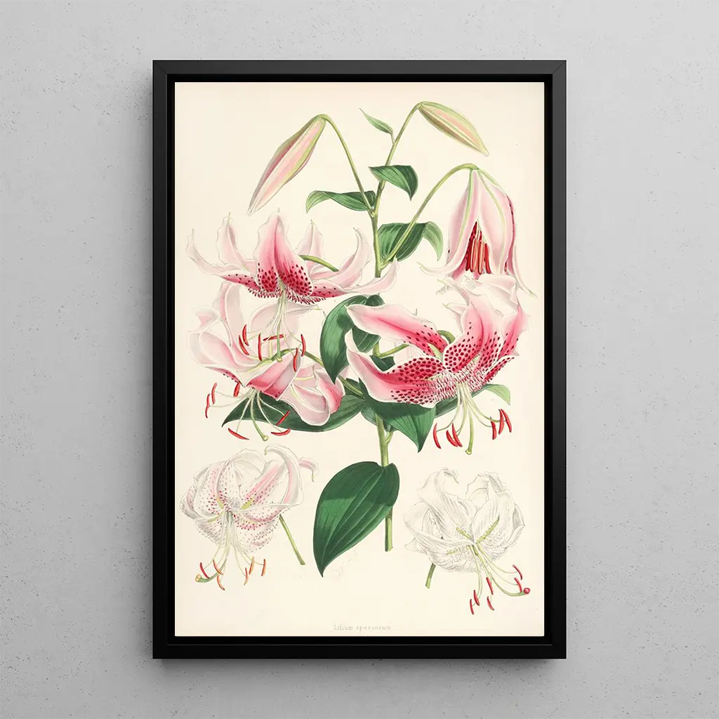 Konsttrycket av Lilium speciosum är ett perfekt dekorativt val för att tillföra en blomstrande touch till ditt hem. Oavsett om det är i ett vardagsrum, ett kontor eller ett sovrum, kommer denna canvas att tilltala med sin utskriftskvalitet och trohet mot originalverkets detaljer. Dess estetiska tilltal gör den till ett centralt element i din inredning, som kan väcka intresse och beundran hos dina gäster. Välj detta konsttryck och låt dig förföras av den tidlösa skönheten i denna botaniska illustration.