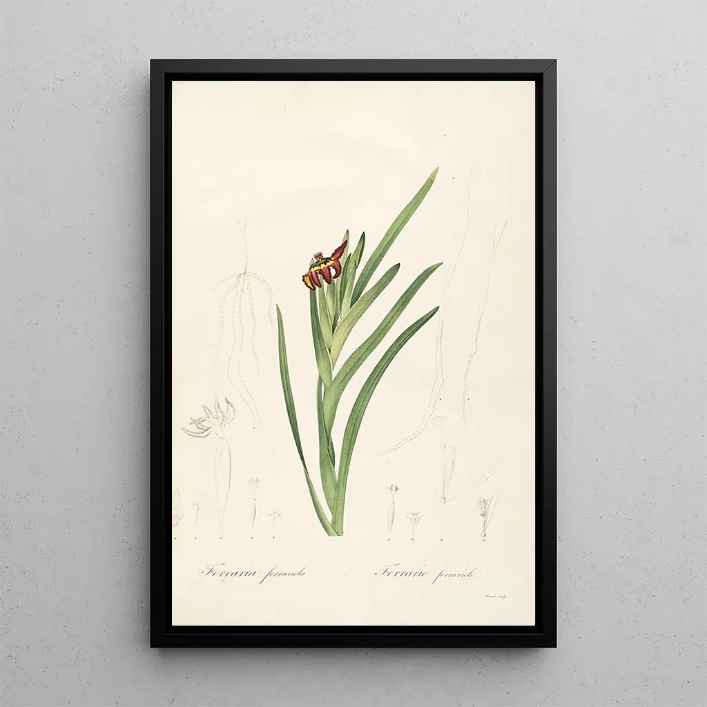 I denna konsttryck av Les Liliacées Pl63 bjuder konstnären Pierre Joseph Redouté in oss i en finstämd värld där varje kronblad tycks vibrera under ljuset. Kompositionen, noggrant utarbetad, framhäver nyanser av grönt och lila som harmoniskt vävs samman. Gouache-tekniken gör det möjligt att återge blommornas textur på ett nästan taktilt sätt, vilket skapar en atmosfär av lugn och förfining. Varje detalj är minutiöst återgiven, ett tecken på en noggrann observation av naturen, vilket ger verket en nästan levande dimension.