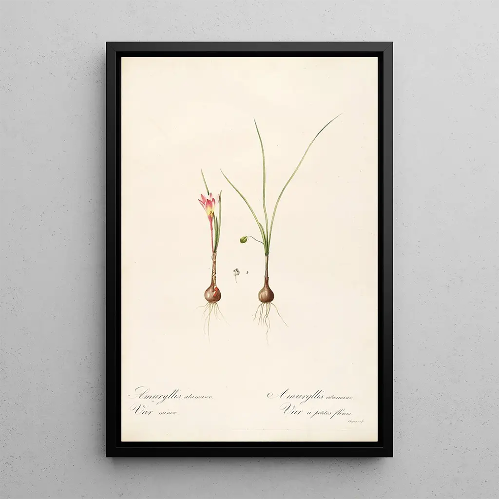I denna konsttryck av verket "Les liliacées Pl33" fördjupar Pierre Joseph Redouté oss i en botanisk värld av sällsynt elegans. Pastellfärgerna, från mjuk rosa till strålande vitt, blandas harmoniskt och skapar en mjuk och lugnande atmosfär. Akvarelltekniken, som behärskas av Redouté, gör det möjligt att återge varje detalj av blommorna med otrolig precision, från de delikata kronbladen till de gröna bladen. Detta konsttryck inbjuder till eftertanke och avslöjar naturens flyktiga skönhet samt konsten att avbilda blommor.
