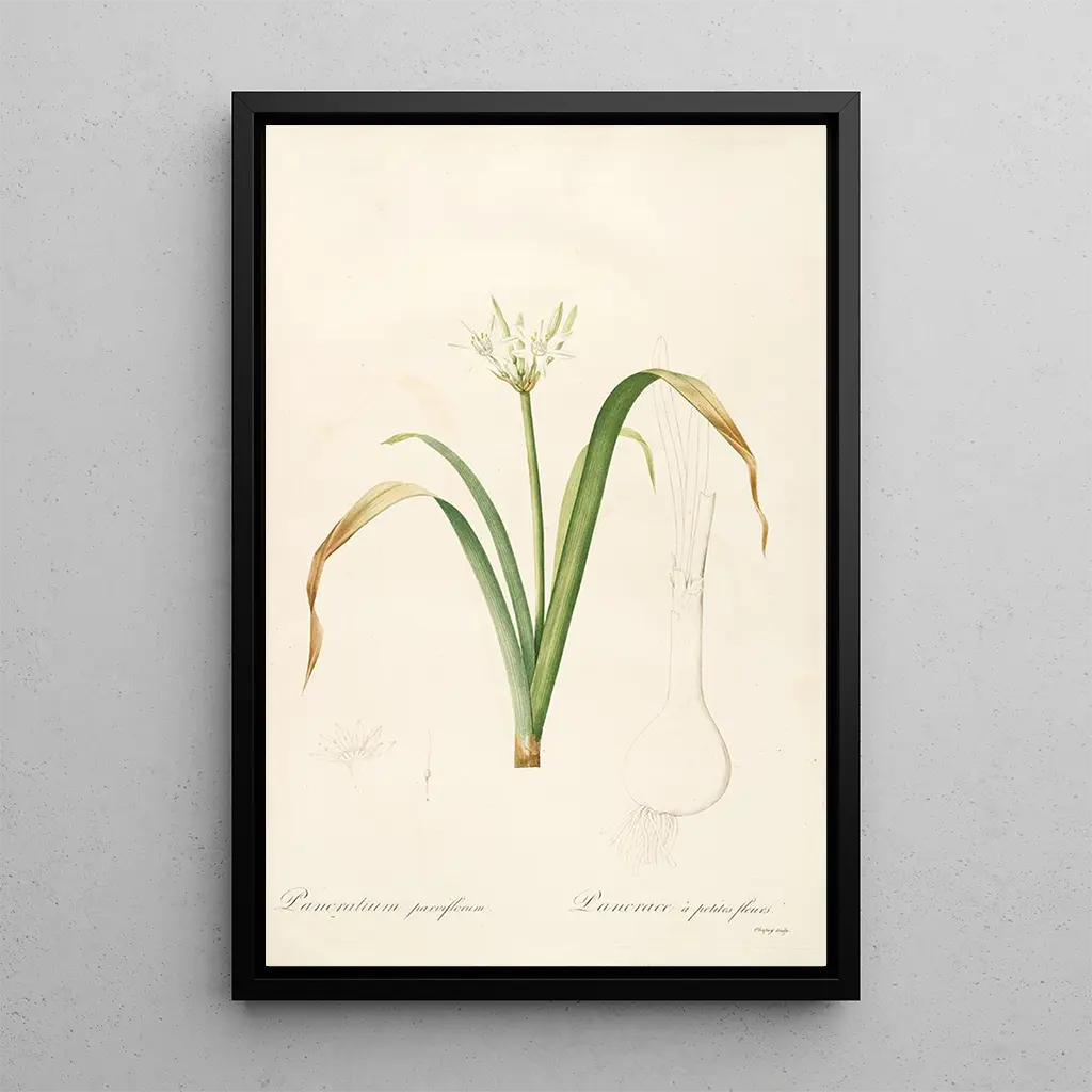 I detta konsttryck av Les Liliacées Pl50 fångar Pierre Joseph Redouté den delikata essensen av blommorna med en enastående precision. Pastellnyanser, från mjuk lila till strålande vitt, blandas harmoniskt och skapar en lugnande atmosfär. Akvarelltekniken gör det möjligt att återge genomskinligheten i kronbladen, medan de noggranna detaljerna i bladen och stjälkarna vittnar om ett enastående hantverk. Varje element känns levande och bjuder in betraktaren att fördjupa sig i en hemlig trädgård där naturen blomstrar i all sin prakt.
