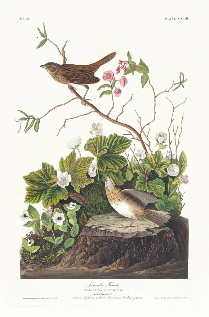 Konsttrycket "Bruant de Lincoln" av John James Audubon fångar den delikata skönheten hos denna sångfågel, som är nästlad i en frodig naturlig miljö. Med jordnära färger och inslag av grönt framkallar verket en lugn och eftertänksam atmosfär. Audubons teknik, som kombinerar akvarell och teckning, gör det möjligt att återge varje fjäder med imponerande precision, samtidigt som det ger scenen liv och energi. Det mjuka ljuset som badar konsttrycket förstärker den fridfulla stämningen och bjuder in betraktaren att fördjupa sig i den vilda faunans skönhet.