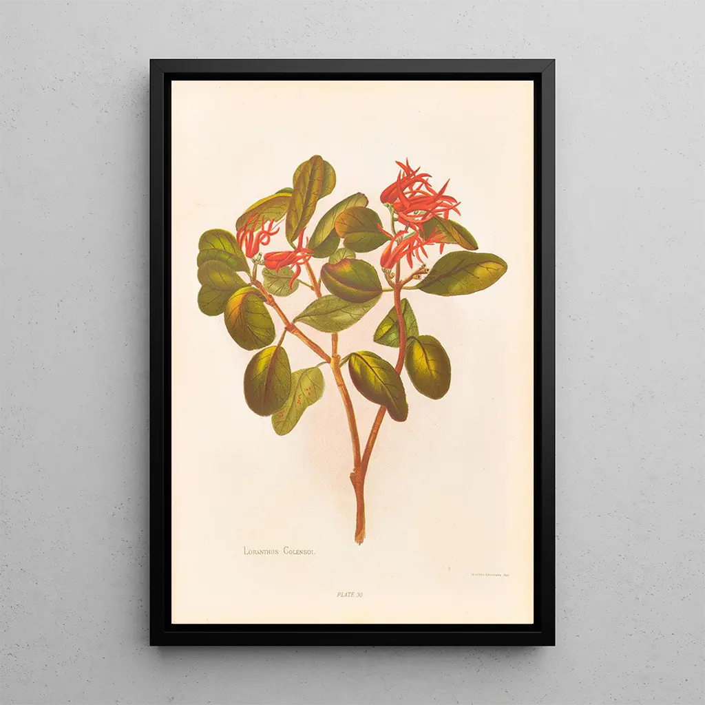 Konsttrycket av Loranthus colensoi är ett perfekt dekorativt val för att tillföra en touch av elegans till ditt hem. Oavsett om det är i ett vardagsrum, ett kontor eller ett sovrum, berikar detta konsttryck utrymmet med sin naturliga skönhet. Dess utskriftskvalitet garanterar trohet mot färger och detaljer i det ursprungliga verket, vilket gör detta konsttryck till ett verkligt estetiskt tillgång. Genom att välja detta konsttryck ger du din inredning ett stycke som hyllar naturen och inbjuder till eftertanke, samtidigt som det väcker intresse och beundran hos dina gäster.