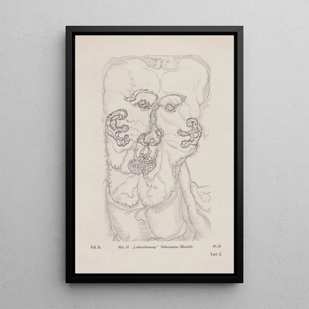 L'œuvre "Apparition aérienne Hallucination Crayon" av Hans Prinzhorn inbjuder till en fascinerande utforskning av den mänskliga sinnet. De livfulla färgerna och de abstrakta formerna blandas för att skapa en atmosfär som är både oroande och fängslande. Den teknik som används, som verkar kombinera teckning med målning, ger liv åt märkliga och poetiska visioner. Varje pennstreck tycks vara ett öppet fönster mot en inre värld, där fantasin och verkligheten sammanflätas. Denna duk, en äkta spegling av tankar och känslor, förflyttar betraktaren till en värld där konst blir ett uttrycksmedel för det osynliga.